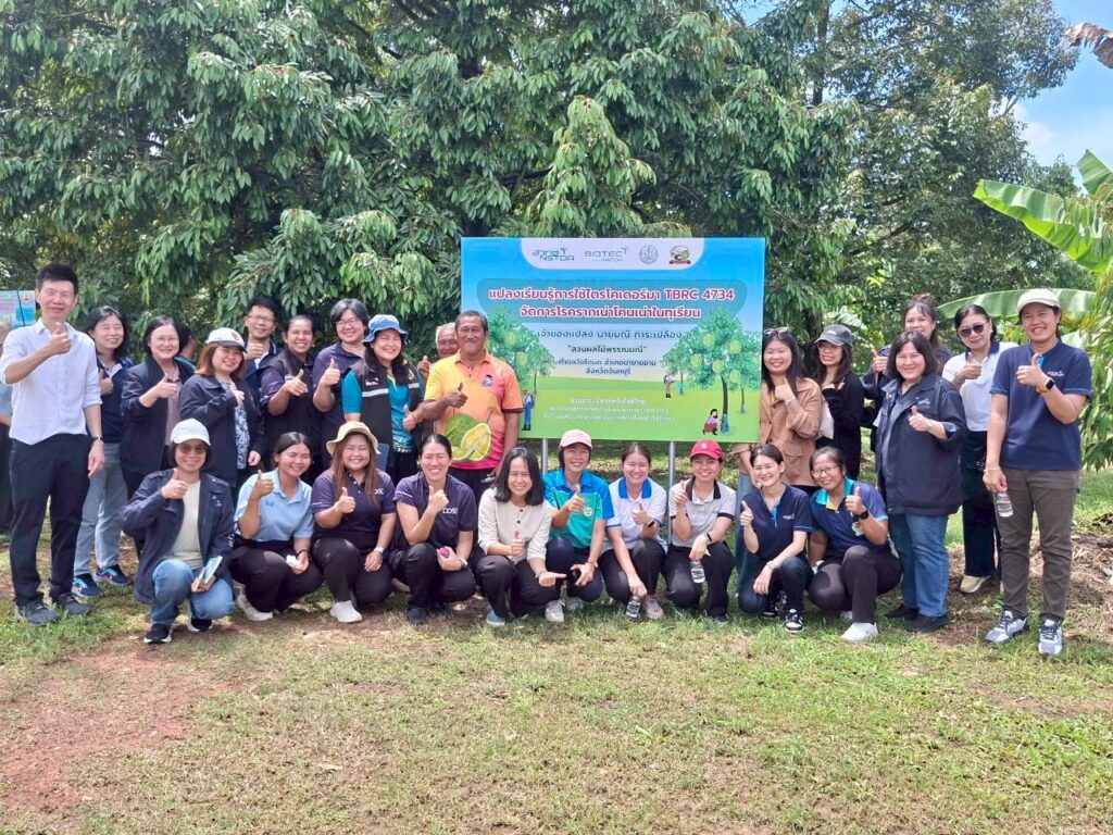 เมื่อวันที่ 10 ตุลาคม 2568 น.ส.เสาวนีย์ ปานประเสริฐกุล นักวิชาการฝ่ายถ่ายทอดเทคโนโลยี สถาบันการจัดการเทคโนโลยีและนวัตกรรมเกษตร (สท.) สวทช. ร่วมต้อนรับคณะจากสำนักงบประมาณเยี่ยมชม “จุดผลิตขยายเชื้อราไตรโคเดอร์มาสายพันธุ์ TBRC 4734 วิสาหกิจชุมชนพัฒนาคุณภาพทุเรียนและการเกษตรบ้านมาบโอน ต.เขาบายศรี อ.ท่าใหม่ จ.จันทบุรี” และ “แปลงเรียนรู้การใช้ไตรโคเดอร์มา TBRC 4734 จัดการโรครากเน่าโคนเน่าในทุเรียน: สวนผลไม้พรรณมณี ต.วังโตนด อ.นายายอาม จ.จันทบุรี” ซึ่ง สท. ได้ดำเนินโครงการขยายผลการถ่ายทอดเทคโนโลยีการบริหารจัดการโรครากเน่าโคนเน่าของทุเรียนด้วยเชื้อราไตรโคเดอร์มาให้กลุ่มเกษตรกรในจังหวัดจันทบุรีมาตั้งแต่ปี พ.ศ. 2567 โดยได้ร่วมกับทีมวิจัยเทคโนโลยีการควบคุมทางชีวภาพ ศูนย์พันธุวิศวกรรมและเทคโนโลยีชีวภาพแห่งชาติ (ไบโอเทค) ถ่ายทอดเทคโนโลยีการผลิตก้อนเชื้อสดราไตรโคเดอร์มาสายพันธุ์ TBRC 4734 ให้สมาชิกวิสาหกิจชุมชนพัฒนาคุณภาพทุเรียนและการเกษตรบ้านมาบโอน ปัจจุบันวิสาหกิจฯ สามารถผลิตก้อนเชื้อสดคุณภาพได้ 1,500 ถุง/เดือน (ถุงละ 200 กรัม) โดยจำหน่ายให้สมาชิกและเกษตรกรในพื้นที่เพื่อนำไปใช้ป้องกันและรักษาโรครากเน่าโคนเน่าในทุเรียน สำหรับนายมณี ภาระเปลื้อง เจ้าของสวนผลไม้พรรณมณี เป็นเกษตรกรที่เข้าร่วมโครงการฯ โดยจัดการแปลงด้วยวิธีผสมผสานตามหลักวิชาการและใช้เชื้อราไตรโคเดอร์มาผสมผสานกับสารเคมี และได้รับสนับสนุนเชื้อราไตรโคเดอร์มาสายพันธุ์ TBRC 4734 จาก สท. เพื่อใช้งานต่อเนื่อง โดยพบว่าสามารถฟื้นฟูต้นทุเรียนที่มีอาการจากโรครากเน่าโคนเน่าได้และยังลดต้นทุนการใช้สารเคมี