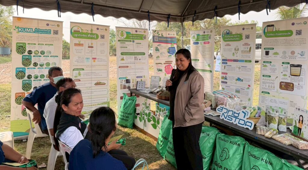 เมื่อวันที่ 24 กุมภาพันธ์ 2569 สถาบันการจัดการเทคโนโลยีและนวัตกรรมเกษตร (สท.) สวทช. ร่วมงาน “Green Grain Day สร้างการเรียนรู้และสร้างแรงจูงใจ ไม่เผาแต่ได้รายได้ปี 2569” ณ แปลงเกษตรกรบ้านสำโรง หมู่ที่ 10 ตำบลคูเมือง อำเภอมหาชนะชัย จังหวัดยโสธร โดย น.ส.ณิฎฐา คุ้มโต นักวิชาการอาวุโส สวทช. และทีมงาน ได้ร่วมให้ความรู้การปลูกถั่วเขียว KUML เป็นพืชหลังนา โดยเป็นหนึ่งในฐานเรียนรู้ภายในงาน กิจกรรมครั้งนี้ได้รับเกียรติจากนายชาญชัย ศรศรีวิชัย ผู้ว่าราชการจังหวัดยโสธร เป็นประธานเปิดงาน และได้เยี่ยมชมนิทรรศการจาก สวทช. พร้อมทั้งชมการหว่านเมล็ดพันธุ์ถั่วเขียว KUML ด้วยโดรน