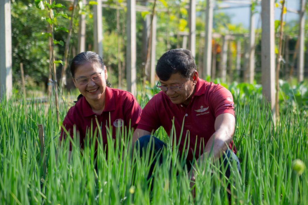 ทั้งคู่เริ่มต้นจากปลูกสวนยางพาราบนเขาที่เมื่อถึงวันเกษียณได้สร้างรายได้ 4-5 หมื่นบาท/เดือน ตามด้วยส้มโอและมะขาม ไม้ผลที่ทุกวันนี้ให้เม็ดเงินตอบแทนกว่าแสนบาทต่อปี เหล่านี้เป็นดอกผลที่มาจากการเตรียมตัวก่อนเกษียณ ขณะที่พืชผักที่หวังปลูกไว้บริโภคเอง กลับพบจุดเปลี่ยนที่สำคัญของชีวิต