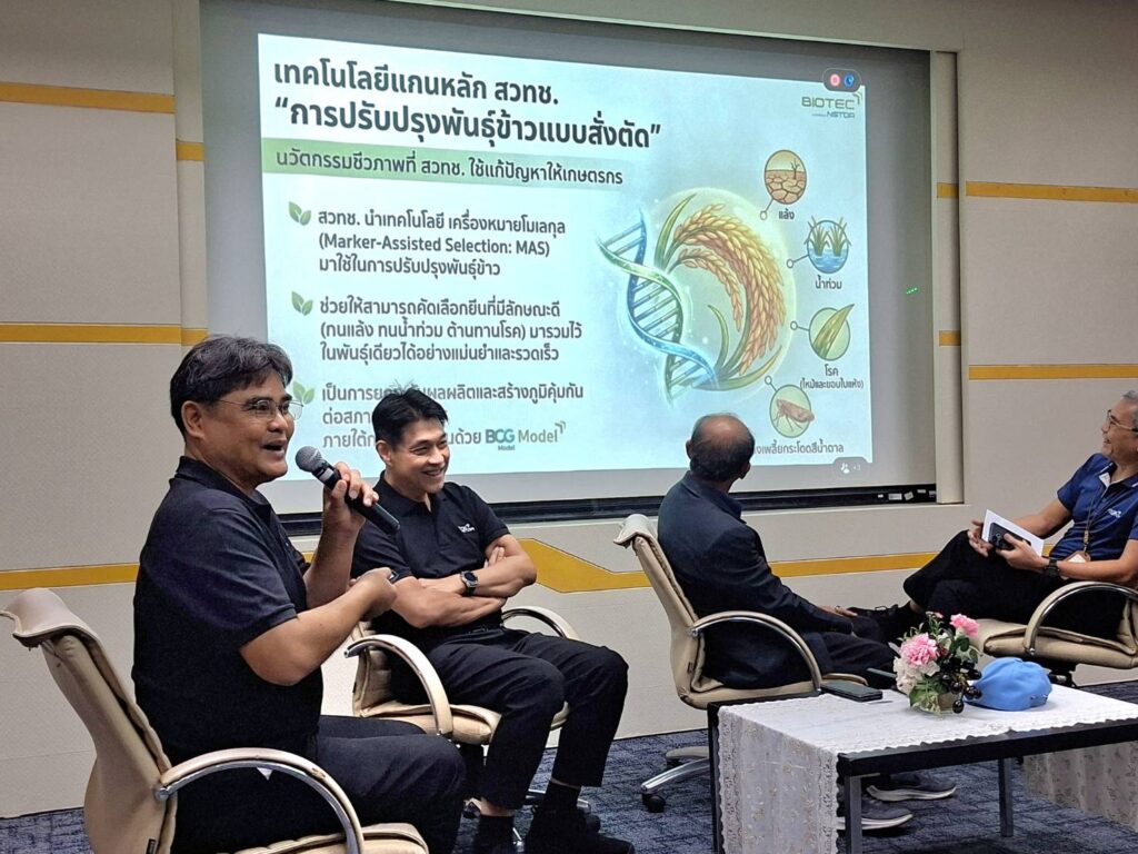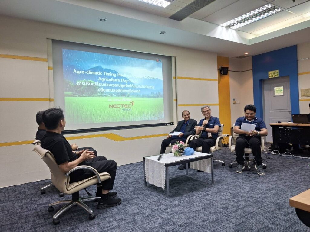วันนี้ (27 เมษายน 2569) สถาบันการจัดการเทคโนโลยีและนวัตกรรมเกษตร (สท.) สวทช. ร่วมจัดกิจกรรมสัมมนาในงานประชุมวิชาการประจำปี 2569 สวทช. หรือ NAC2026 ในหัวข้อ “การปรับตัวของเกษตรกรไทยในการปลูกข้าวในสภาวะ Climate Change” โดยมีนักวิจัยจาก สวทช. ร่วมนำเสนอเทคโนโลยีและแลกเปลี่ยนความคิดเห็น ได้แก่ ดร.มีชัย เซี่ยงหลิว นักวิจัยศูนย์พันธุวิศวกรรมและเทคโนโลยีชีวภาพแห่งชาติ (ไบโอเทค) นำเสนอเทคโนโลยีการพัฒนาพันธุ์ข้าวหรือ “นวัตกรรมพันธุ์ข้าวสั่งตัด” ที่ช่วยลดความเสี่ยง เพิ่มรายได้ และสร้างความยั่งยืน ดร.ธีระ ภัทราพรนันท์ นักวิจัยศูนย์เทคโนโลยีอิเล็กทรอนิกส์และคอมพิวเตอร์แห่งชาติ (เนคเทค) นำเสนอเทคโนโลยี RiceFit it: ระบบแนะนำพันธุ์ข้าวที่เหมาะสมสำหรับการปลูกในพื้นที่และฤดูกาล และ ดร.นพดล คีรีเพ็ชร นักวิจัยอาวุโสศูนย์เทคโนโลยีอิเล็กทรอนิกส์และคอมพิวเตอร์แห่งชาติ (เนคเทค) นำเสนอเทคโนโลยี Ag-TIMA ระบบแนะนำช่วงเวลาเพาะปลูกข้าวที่เหมาะสมต่อการเปลี่ยนแปลงของสภาพภูมิอากาศ นอกจากนี้ยังมี นายบุญเหลือ ฤทธิรณ ประธานกลุ่มเครือข่ายผู้ผลิตข้าวอินทรีย์หอมมะลิ 105 ต.ชุมพลบุรี อ.ชุมพลบุรี จ.สุรินทร์ ได้ร่วมแลกเปลี่ยนประสบการณ์การปลูกข้าวหอมมะลิในพื้นที่ทุ่งกุลาร้องไห้ รวมถึงการทดสอบปลูกพันธุ์ข้าวหอมสยาม 2 ในฤดูกาลผลิตปีที่แล้ว ซึ่งมีปริมาณฝนมาก (สภาวะลานีญา) แต่ข้าวฟื้นตัวได้ดีและให้ผลผลิตสูง กิจกรรมสัมมนาครั้งนี้ดำเนินรายการโดย ดร.ศรีสวัสดิ์ ขันทอง ผู้ช่วยวิจัย ศูนย์พันธุวิศวกรรมและเทคโนโลยีชีวภาพแห่งชาติ (ไบโอเทค)
