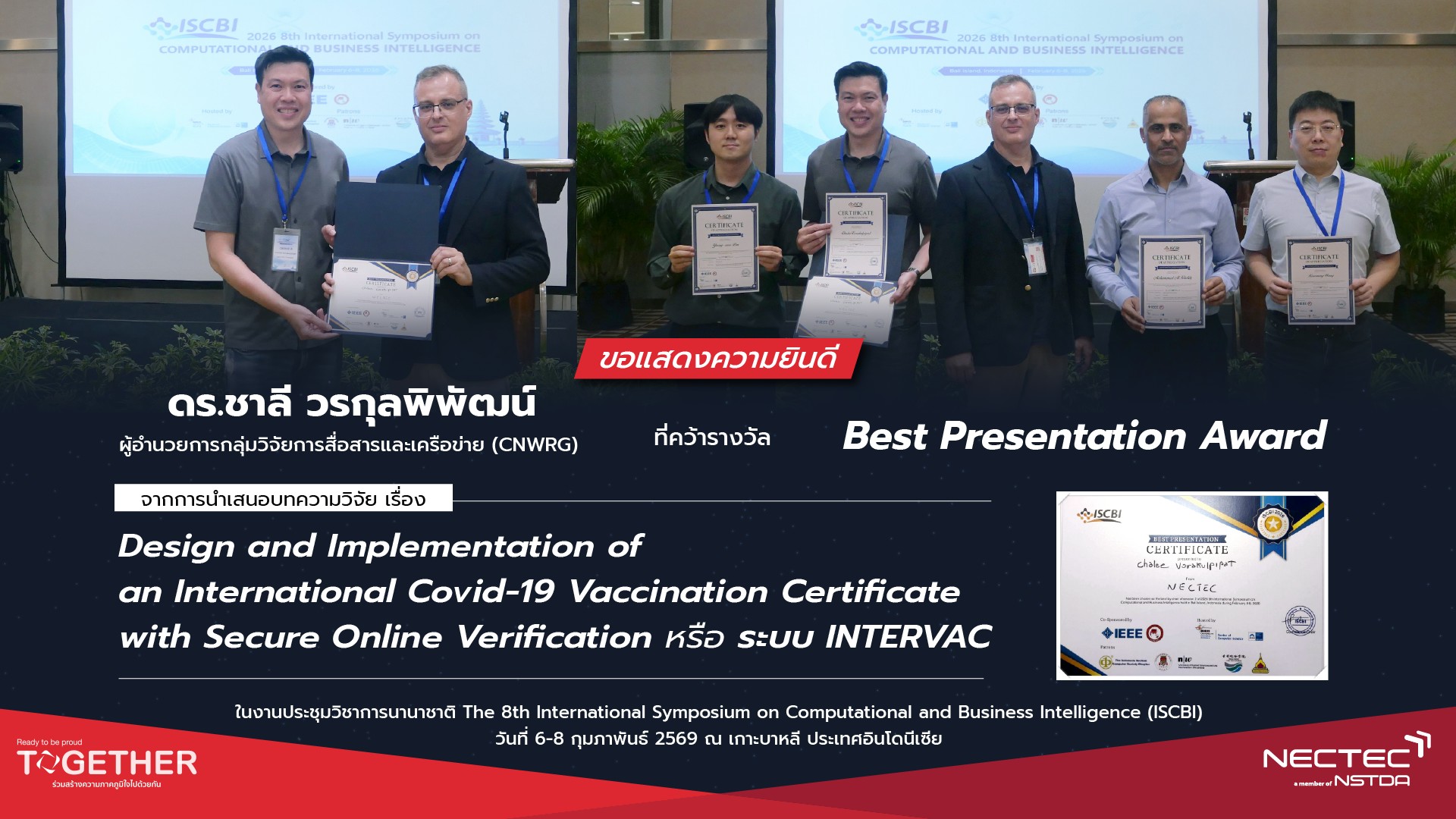 ดร.ชาลี วรกุลพิพัฒน์ ผู้อำนวยการกลุ่มวิจัยการสื่อสารและเครือข่าย (CNWRG) ศูนย์เทคโนโลยีอิเล็กทรอนิกส์และคอมพิวเตอร์แห่งชาติ (เนทเทค) สำนักงานพัฒนาวิทยาศาสตร์และเทคโนโลยีแห่งชาติ (สวทช.) ได้รับรางวัล Best Presentation Award จากการนำเสนอบทคัดย่องานวิจัยหัวข้อ “Design and Implementation of an International Covid-19 Vaccination Certificate with Secure Online Verification” หรือ ระบบ INTERVAC ในงานประชุมวิชาการนานาชาติ The 8th International Symposium on Computational and Business Intelligence (ISCBI) วันที่ 6-8 กุมภาพันธ์ 2569 ณ เกาะบาหลี ประเทศอินโดนีเซีย