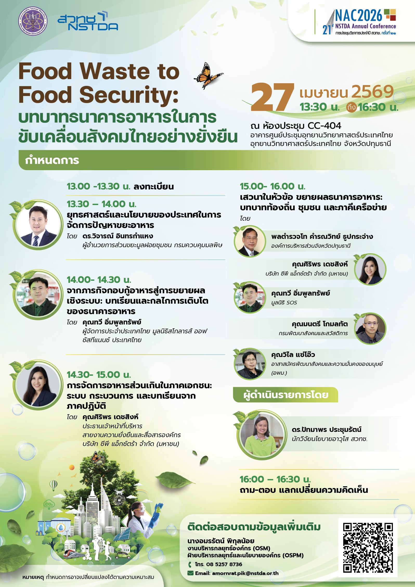 กิจกรรมสัมมนาวิชาการในประเด็นที่เกี่ยวข้องกับ Food Waste to Food Security ในการประชุมวิชาการประจำปี สวทช. ครั้งที่ 21 วันที่ 27 เมษายน 2569 เวลา 13:30-16:30 น. ณ ห้อง CC-404 อาคารศูนย์ประชุมฯ , อาคาร CC (ตึก 14) สนใจลงทะเบียนสัมมนาได้ที่ https://www.nstda.or.th/nac/2026/seminar/nac-19/