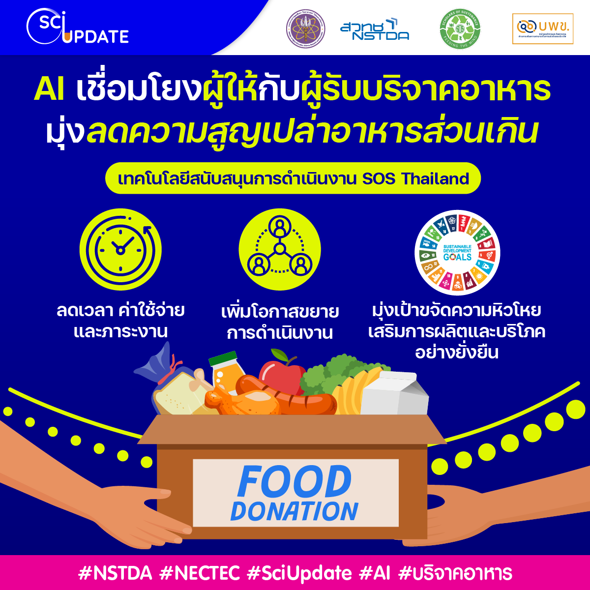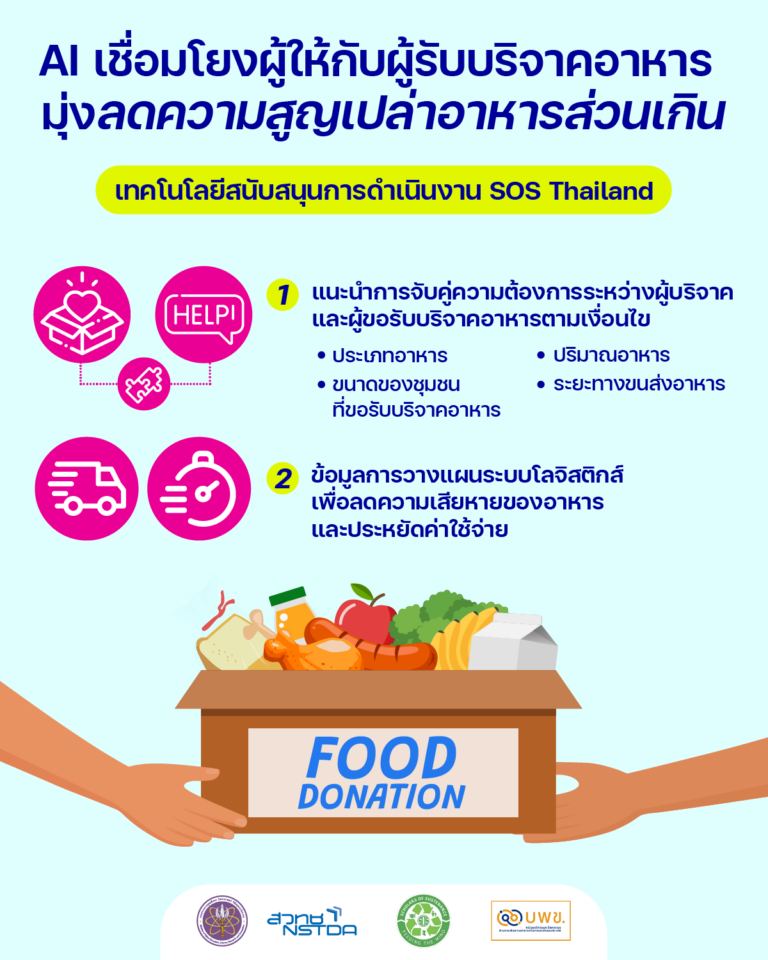 ทั้งนี้เพื่อสนับสนุนให้เจ้าหน้าที่ SOS Thailand ดำเนินงานได้สะดวกและรวดเร็ว มีความพร้อมที่จะขยายการดำเนินงานไปยังพื้นที่อื่น ๆ ที่ยังคงต้องการความช่วยเหลือมากยิ่งขึ้น กระทรวงการอุดมศึกษา วิทยาศาสตร์ วิจัยและนวัตกรรม (อว.) โดยศูนย์เทคโนโลยีอิเล็กทรอนิกส์และคอมพิวเตอร์แห่งชาติ (เนคเทค) สำนักงานพัฒนาวิทยาศาสตร์และเทคโนโลยีแห่งชาติ (สวทช.) ได้พัฒนาแพลตฟอร์ม AI ช่วยแนะนำการจับคู่ความต้องการระหว่างผู้บริจาคกับผู้ขอรับบริจาคอาหารแบบอัตโนมัติ เพื่อช่วยลดภาระและเวลาการทำงานให้แก่เจ้าหน้าที่ โดยการวิจัยและพัฒนานี้ได้รับการสนับสนุนจากหน่วยบริหารและจัดการทุนด้านการเพิ่มความสามารถในการแข่งขันของประเทศ (บพข.)