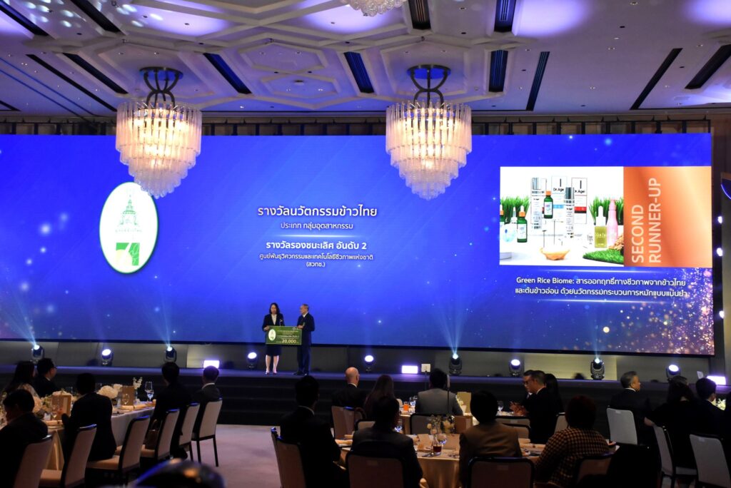 ผลงานที่ได้รับรางวัลคือ “Green Rice Biome : สารออกฤทธิ์ทางชีวภาพจากข้าวไทยและต้นข้าวอ่อนด้วยนวัตกรรมกระบวนการหมักแบบแม่นยำ” ภายใต้การพัฒนาของแพลตฟอร์มบริการผลิตอาหารและส่วนผสมฟังก์ชัน (FoodSERP) ของ สวทช. เป็นนวัตกรรมการเพิ่มมูลค่าของข้าวไทยด้วยเทคโนโลยีการหมักแบบแม่นยำ (precision fermentation) ซึ่งได้นำร่องพัฒนากระบวนการผลิตสารประกอบฟังก์ชันจากข้าวหอมมะลิอินทรีย์ ผ่านกระบวนการผลิตผลิตภัณฑ์ชีวภาพ (bioproducts) โดยอาศัยหลักการแปรสภาพทางชีวภาพ (biotransformation) ด้วยจุลินทรีย์ เทคโนโลยีการหมักแบบแม่นยำนี้ ถือเป็นนวัตกรรมเทคโนโลยีสีเขียวที่มีศักยภาพสูงซึ่งถูกนำมาประยุกต์ใช้ในการเพิ่มมูลค่าของวัตถุดิบข้าวไทยเพื่อพัฒนานวัตกรรมกระบวนการผลิตส่วนประกอบฟังก์ชันสำหรับเครื่องสำอางในกลุ่มผลิตภัณฑ์ดูแลผิว
