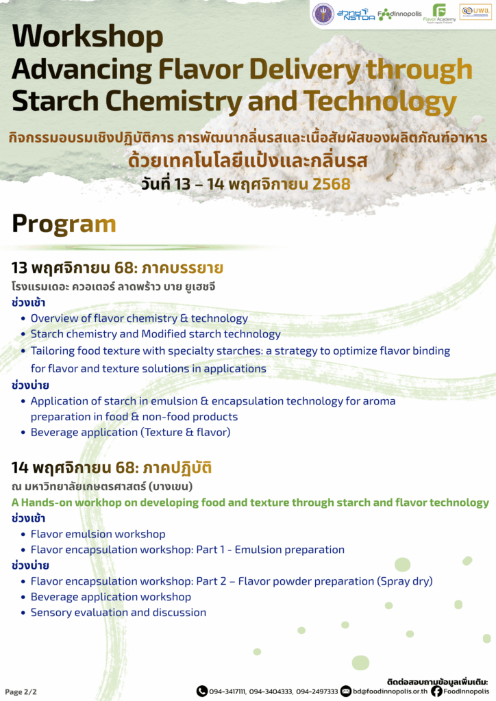 📢 Flavor Academy โดย Food Innopolis, สวทช. ขอเชิญท่านที่สนใจร่วมเรียนรู้เทคโนโลยี และเคมีของแป้งที่มีบทบาทสำคัญในการควบคุมและส่งผ่านกลิ่นรสในผลิตภัณฑ์อาหารและเครื่องดื่ม เพื่อให้ได้ผลิตภัณฑ์ที่มีกลิ่นรสสม่ำเสมอและโดดเด่นมากยิ่งขึ้น โดยวิทยากรผู้เชี่ยวชาญ และคร่ำหวอดในอุตสาหกรรมแป้ง และบริษัทอาหารชั้นนำมาอย่างยาวนาน