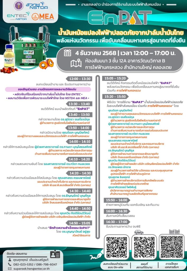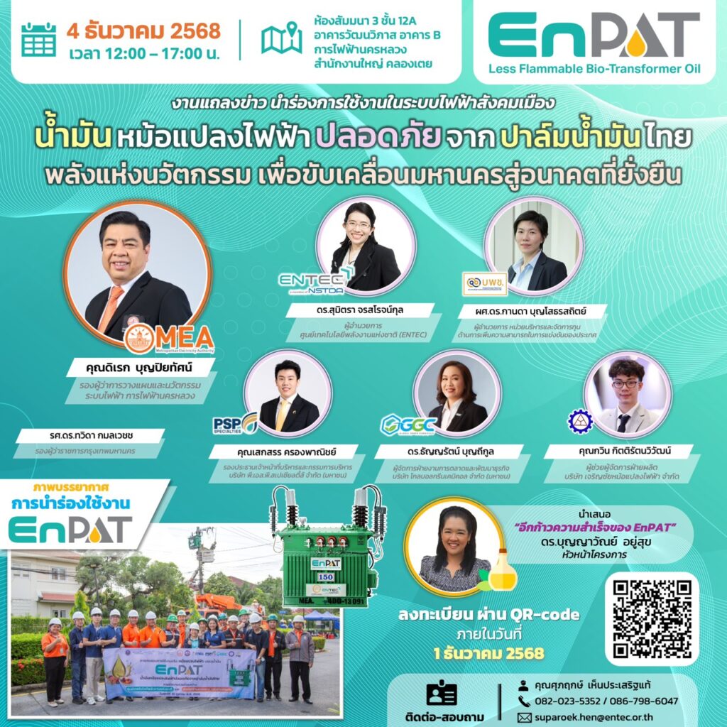 🔬ทีมวิจัยกำหนดจัดงานแถลงข่าว “EnPAT น้ำมันหม้อแปลงไฟฟ้าปลอดภัย นำร่องการใช้งานในสังคมเมือง ร่วมกับ การไฟฟ้านครหลวง – พลังแห่งนวัตกรรม เพื่อขับเคลื่อนมหานครสู่อนาคตที่ยั่งยืน” ใน วันพฤหัสบดีที่ 4 ธันวาคม พ.ศ. 2568 เวลา 12:00 – 17:00 น. ณ ห้องสัมมนา 3 ชั้น 12A อาคารวัฒนวิภาส B การไฟฟ้านครหลวง สำนักงานใหญ่คลองเตย
