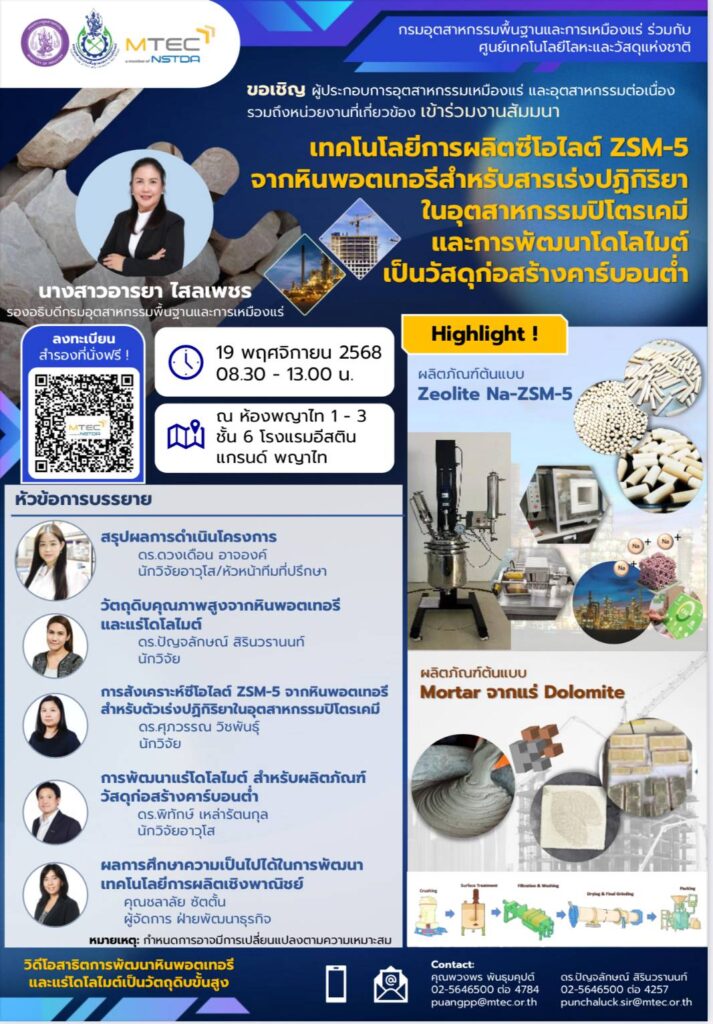 สัมมนา ฟรี! “เทคโนโลยีการผลิตซีโอไลต์ ZSM-5 จากหินพอตเทอรี่ สำหรับสารเร่งปฏิกิริยาในอุตสาหกรรมปิโตรเคมี และการพัฒนาโดโลไมต์เป็นวัสดุก่อสร้างคาร์บอนต่ำ”