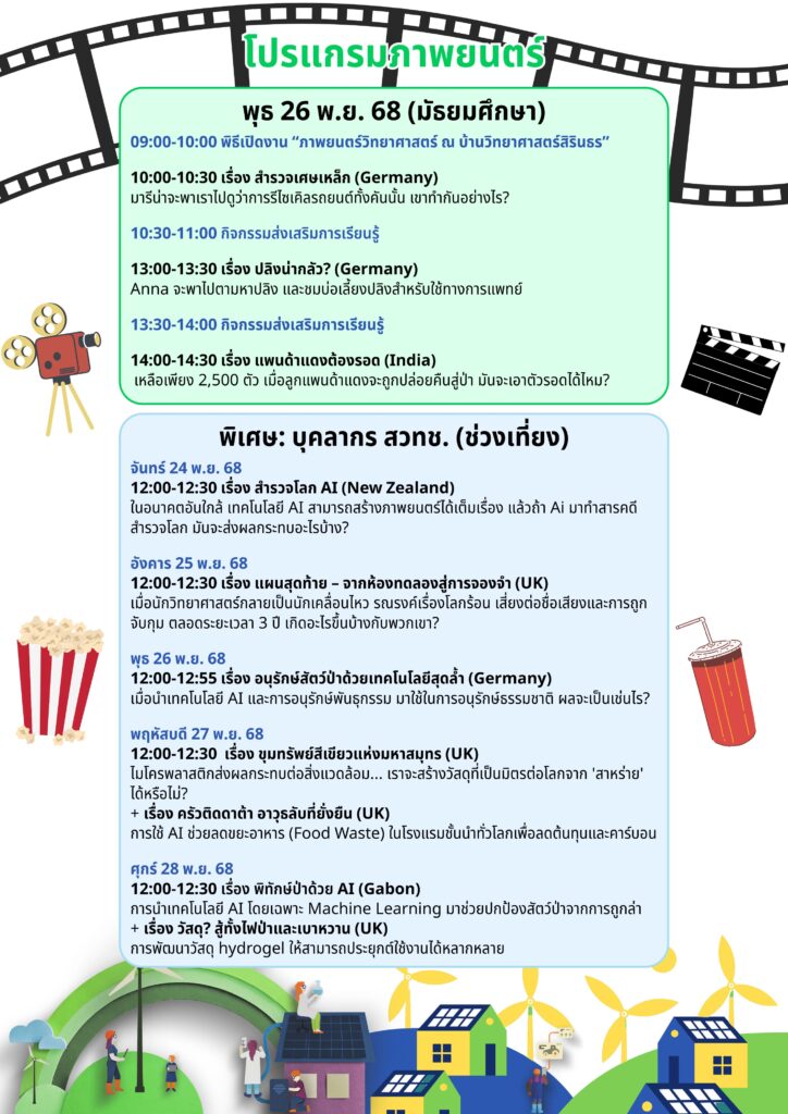 บ้านวิทยาศาสตร์สิรินธร สำนักงานพัฒนาวิทยาศาสตร์และเทคโนโลยีแห่งชาติ (สวทช.) ร่วมกับสถาบันเกอเธ่ ประเทศไทย จัดกิจกรรม “ภาพยนตร์วิทยาศาสตร์ (Science Film Festival) ประจำปี 2568” ภายใต้หัวข้อ Green Jobs