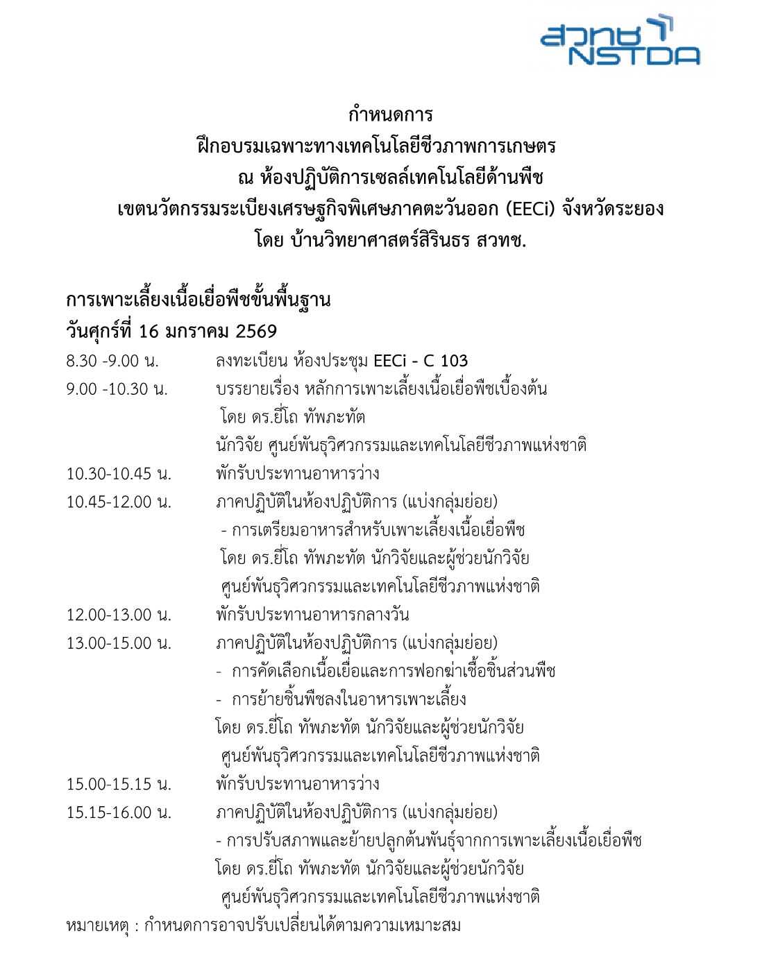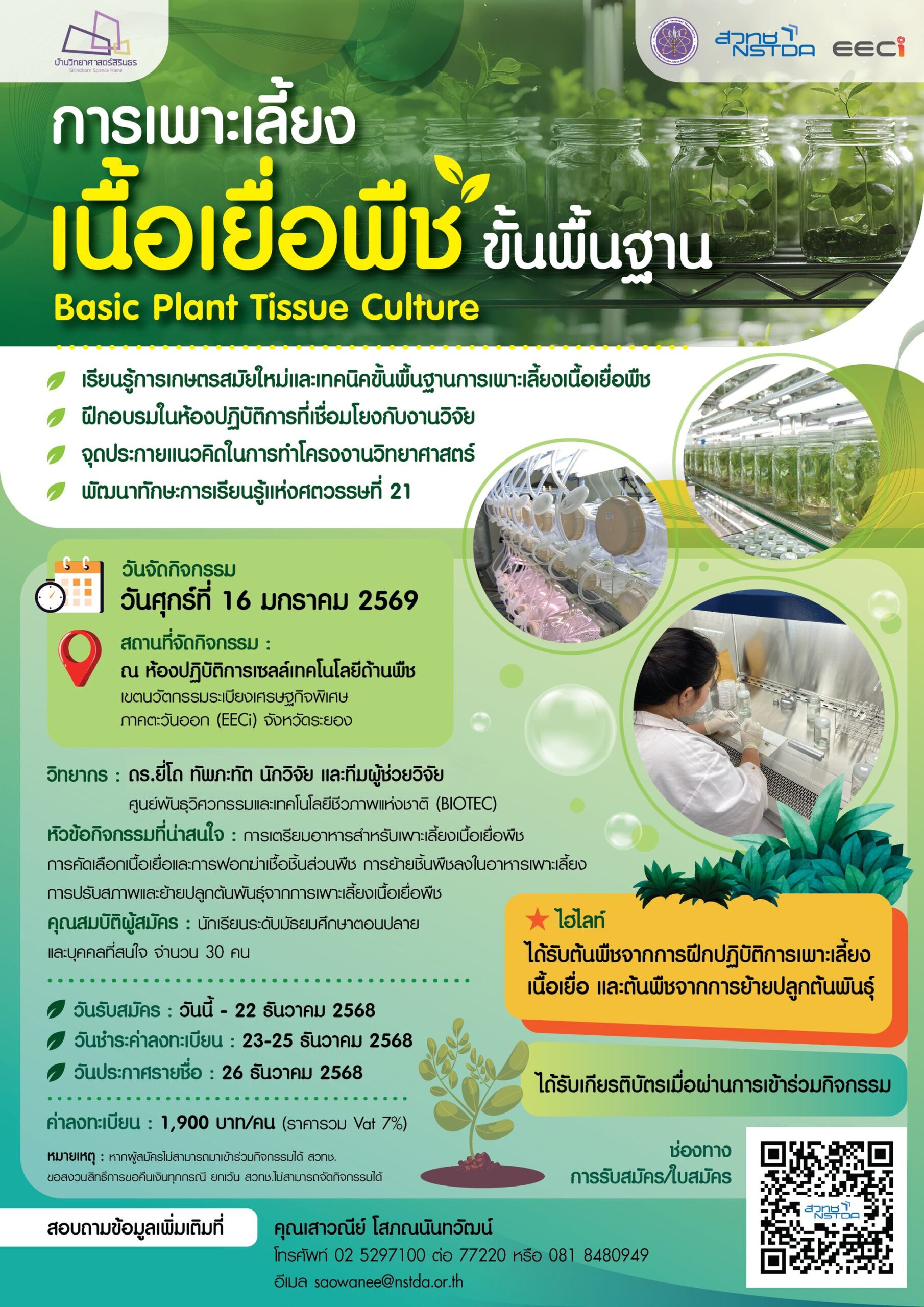 สำหรับนักเรียนชั้นมัธยมศึกษาตอนปลายและบุคคลที่สนใจ ในวันศุกร์ที่ 16 มกราคม 2569 ณ ห้องปฏิบัติการเซลล์เทคโนโลยีด้านพืช เขตนวัตกรรมระเบียงเศรษฐกิจพิเศษภาคตะวันออก (EECi) จังหวัดระยอง