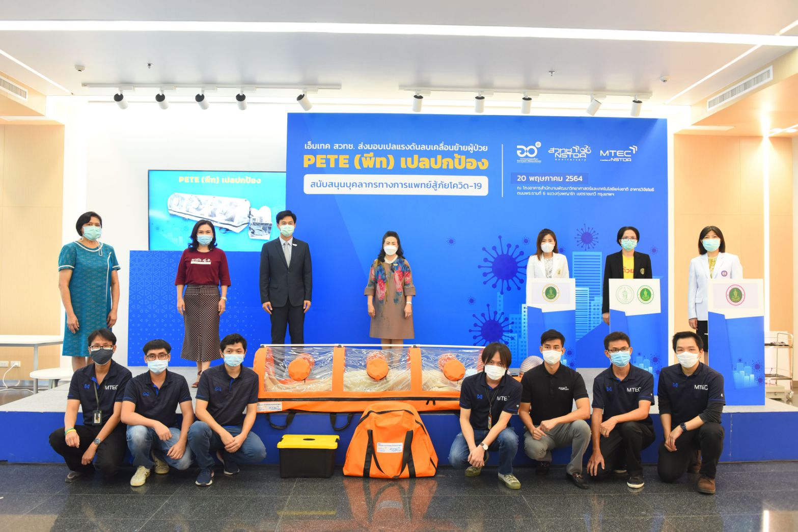 นำโดย ดร.จุลเทพ ขจรไชยกูล ผู้อำนวยการเอ็มเทค สวทช. นางกุลประภา นาวานุเคราะห์ ผู้ช่วยผู้อำนวยการ สวทช. พร้อมด้วยทีมวิจัยเอ็มเทค ได้แก่ ดร.ศราวุธ เลิศพลังสันติ และ ดร.ก่อเกียรติ เศษชัยชาญ ร่วมกันส่งมอบ PETE (พีท) เปลปกป้อง: เปลความดันลบเคลื่อนย้ายผู้ป่วยโควิด-19 จำนวน 3 ชุด และรถส่งของบังคับทางไกล “อารี” เพื่อบุคลากรทางการแพทย์ สำหรับใช้ขนส่งสัมภาระให้ผู้ป่วยโควิด-19 จำนวน 1 ชุด ให้แก่โรงพยาบาลและโรงพยาบาลสนาม สนับสนุนการปฏิบัติงานของบุคลากรทางการแพทย์เพื่อรับมือสถานการณ์การระบาดโรคโควิด-19