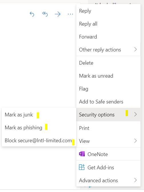3. ทำการ block ผู้ส่งหรือรายงานว่าเป็น phishing เช่น ในกรณีของ outlook ทำได้ดังนี้