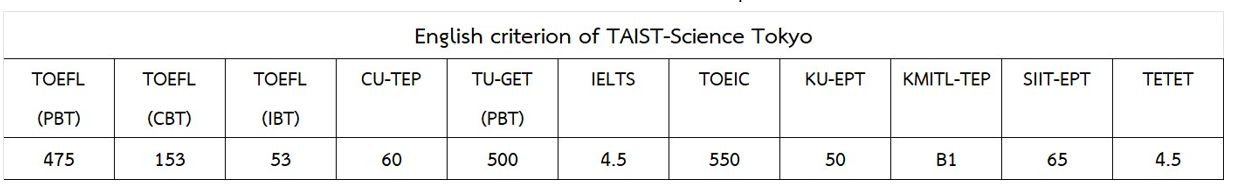 - ผู้สมัครจะต้องส่งผลคะแนนวัดความสามารถทางภาษาอังกฤษอย่างใดอย่างหนึ่ง ดังต่อไปนี้