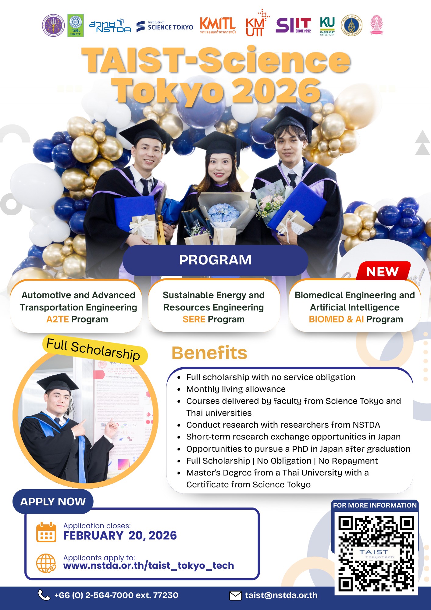 ตามที่สำนักงานพัฒนาวิทยาศาสตร์และเทคโนโลยีแห่งชาติ ร่วมกับ Institute of Science Tokyo (Science Tokyo) ประเทศญี่ปุ่น สถาบันเทคโนโลยีพระจอมเกล้าเจ้าคุณทหารลาดกระบัง สถาบันเทคโนโลยีนานาชาติสิรินธร มหาวิทยาลัยธรรมศาสตร์ มหาวิทยาลัยเกษตรศาสตร์ และมหาวิทยาลัยเทคโนโลยีพระจอมเกล้าธนบุรี มหาวิทยาลัยมหิดล และจุฬาลงกรณ์มหาวิทยาลัย ร่วมเปิดหลักสูตรด้านวิศวกรรมศาสตร์ ระดับปริญญาโท นานาชาติ ภายใต้ “โครงการ TAIST-Science Tokyo” ซึ่งได้เริ่มดำเนินโครงการมาตั้งแต่ พ.ศ. 2550 จนถึงปัจจุบัน ทั้งนี้ตั้งแต่ปีการศึกษา 2565 เป็นต้นมา สำนักงานการวิจัยแห่งชาติ (วช.) ได้ให้การสนับสนุนทุนอุดหนุนการทำกิจกรรมส่งเสริมและสนับสนุนการวิจัยและนวัตกรรม เพื่อพัฒนาบุคลากรวิจัยและวิศวกรรมทักษะสูงตามความต้องการของประเทศ ประกอบด้วย 3 หลักสูตร ดังนี้