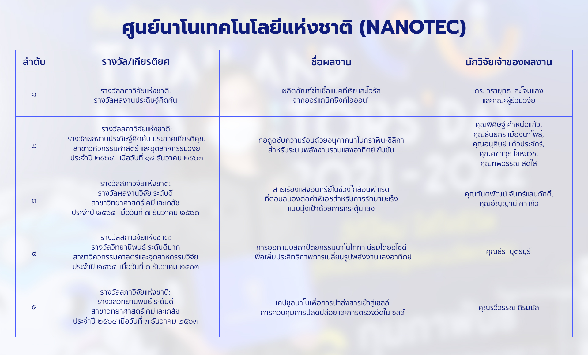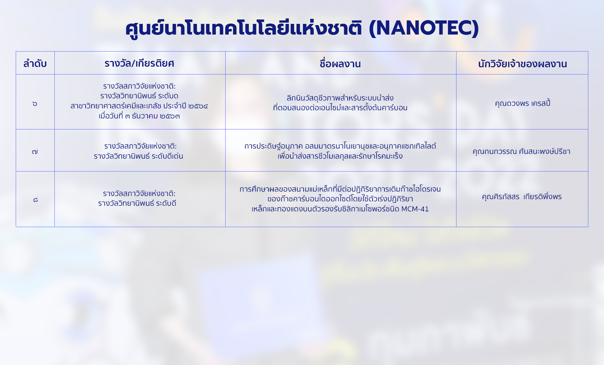 พร้อมด้วยพิธีมอบรางวัลการวิจัยแห่งชาติ ประจำปี 2564 2565 เป็นครั้งที่ 47 ณ ศูนย์นิทรรศการและการประชุมไบเทค บางนา กรุงเทพมหานคร ทั้งนี้ ดร.วรรณี ฉินศิริกุล ผู้อำนวยการศูนย์นาโนเทคโนโลยีแห่งชาติ(นาโนเทค) สำนักงานพัฒนาวิทยาศาสตร์และเทคโนโลยีแห่งชาติ(สวทช.) ร่วมแสดงความยินดีกับนักวิจัย สวทช. ที่ได้รับรางวัลนักวิจัยดีเด่นในสาขาต่างๆ ซึ่งในปีนี้ผู้ที่ได้รับรางวัลประกอบด้วยดังนี้