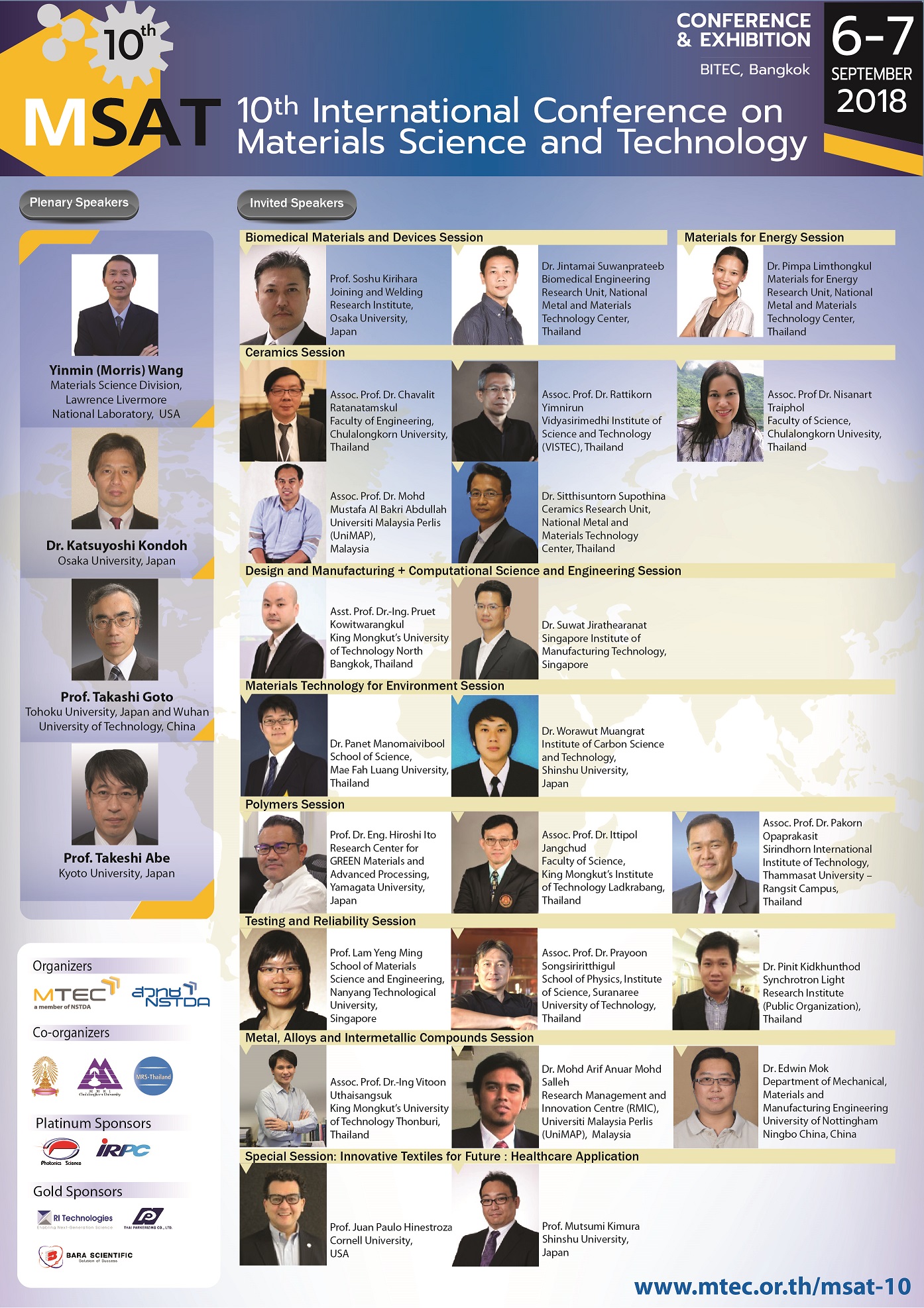 ศูนย์เทคโนโลยีโลหะและวัสดุแห่งชาติ (เอ็มเทค) สำนักงานพัฒนาวิทยาศาสตร์และเทคโนโลยีแห่งชาติ (สวทช.) ขอเชิญผู้ประกอบการอุตสาหกรรม ผู้บริหารองค์กร วิศวกร นักวิจัย นักวิชาการ และผู้สนใจความก้าวหน้าล่าสุดและแนวโน้มของโลกด้านเทคโนโลยีวัสดุและวิศวกรรม เข้าร่วมงาน “การประชุมวิชาการและนิทรรศการนานาชาติด้านเทคโนโลยีวัสดุ ครั้งที่ 10 (The 10th International Conference on Materials Science and Technology: MSAT-10)” ระหว่างวันที่ 6 – 7 กันยายน 2561 ณ ห้องประชุมแกรนด์ฮอลล์ ศูนย์นิทรรศการและการประชุมไบเทค กรุงเทพฯ