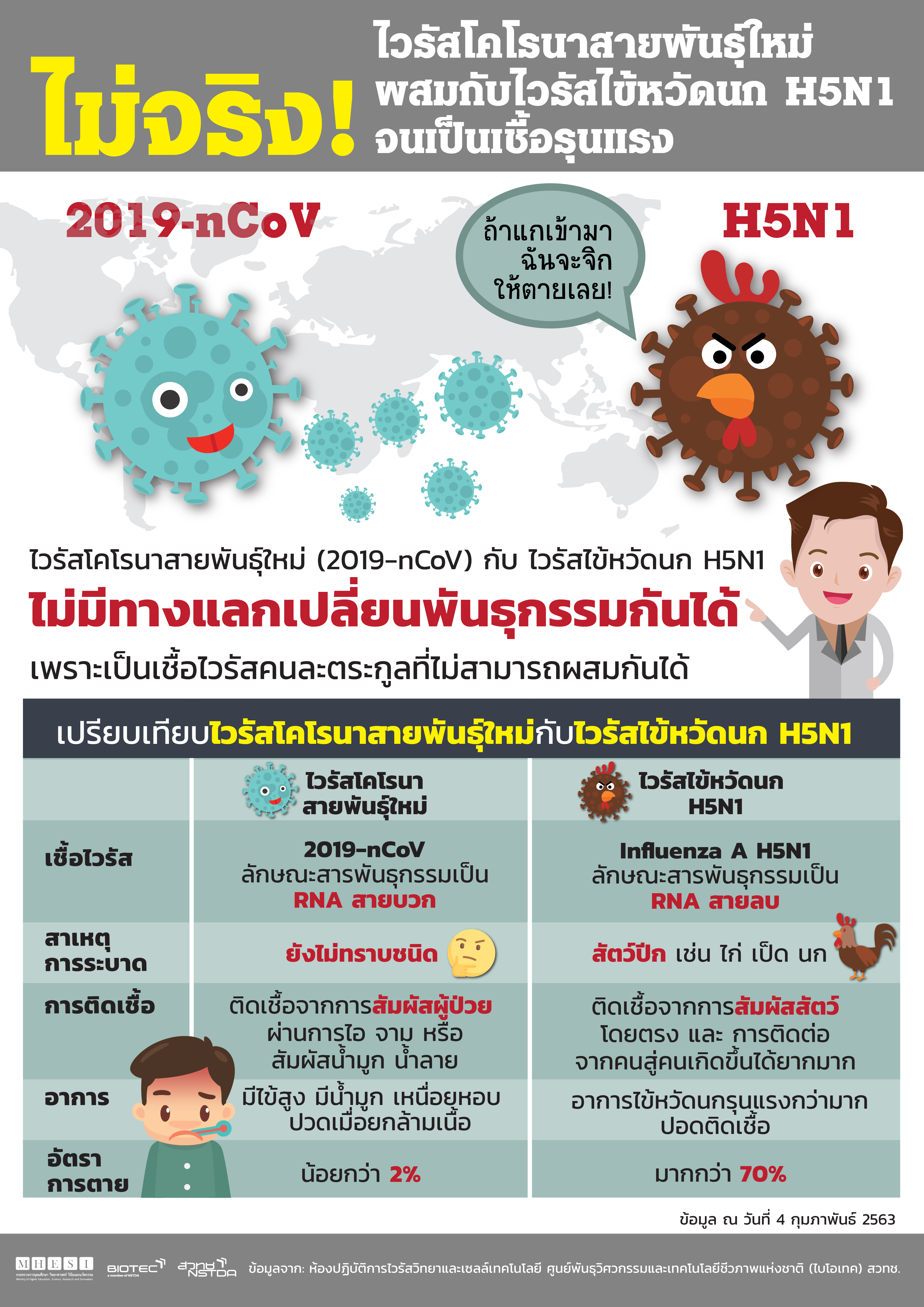 ไม่จริง!! ไวรัสโคโรนาสายพันธุ์ใหม่ผสมกับไวรัสไข้หวัดนก H5N1 จนเป็นเชื้อรุนแรง