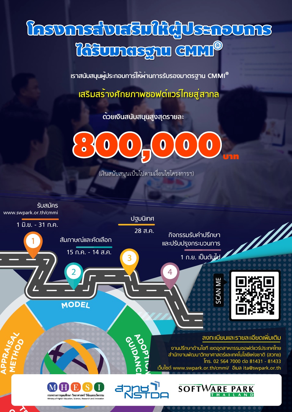 สำนักงานพัฒนาวิทยาศาสตร์และเทคโนโลยีแห่งชาติ (สวทช.) โดยเขตอุตสาหกรรมซอฟต์แวร์ประเทศไทย (ซอฟต์แวร์พาร์ค) ขอเชิญผู้ประกอบการซอฟต์แวร์ ที่มุ่งมั่นพัฒนาคุณภาพผลิตภัณฑ์และบริการ รวมถึงผู้ประกอบการในอุตสาหกรรมอื่น ๆ ที่ต้องการประยุกต์ใช้และขอรับรองมาตรฐาน CMMI® สมัครเข้าร่วม “โครงการส่งเสริมให้ผู้ประกอบการได้รับมาตรฐาน CMMI® (Capability Maturity Model Integration Promotion Project) ปี 2563” เพื่อปรับปรุงประสิทธิภาพกระบวนการพัฒนาและการบริการให้มีคุณภาพด้านซอฟต์แวร์ที่ดี เป็นมาตรฐานที่ยอมรับและได้รับความนิยมแพร่หลายทั่วโลก พร้อมสร้างศักยภาพอุตสาหกรรมซอฟต์แวร์ไทยสู่สากล โดยโครงการฯ จะให้ทุนสนับสนุนสูงสุดรายละ 800,000 บาท แก่ผู้ประกอบการที่ผ่านประเมินมาตรฐาน CMMI® แล้วอย่างเป็นทางการ เปิดรับสมัครตั้งแต่วันนี้ – 31 กรกฎาคม 2563 ดูรายละเอียดเพิ่มเติมได้ที่ http://www.swpark.or.th/cmmi/ หรือสอบถามงานปรึกษาด้านไอที โทร. 0 2583 9992 ต่อ 1431-3 หรือ อีเมล cmmi@swpark.or.th