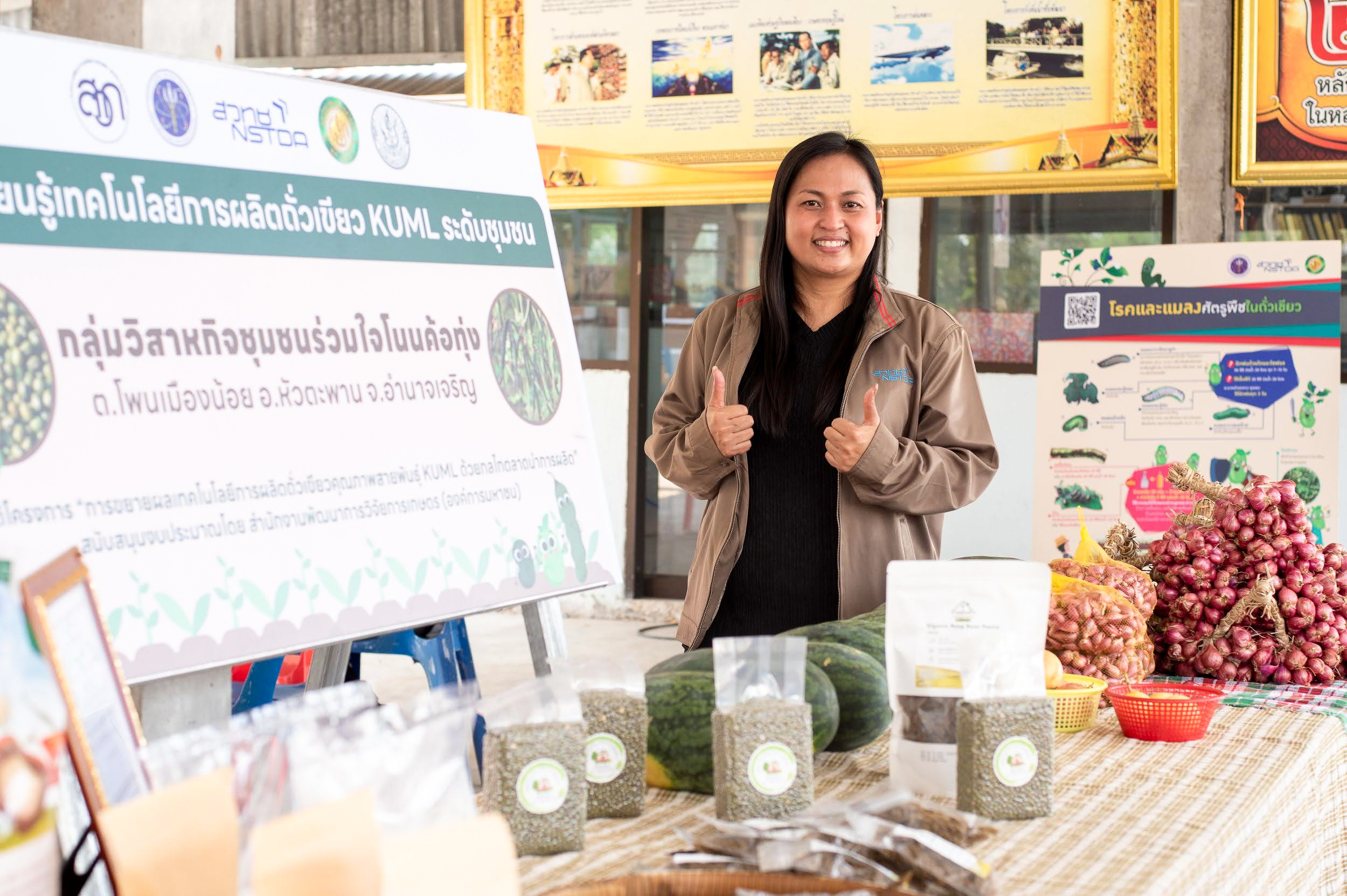 นางสาววิราภรณ์ มงคลไชยสิทธิ์ ผู้ช่วยผู้อำนวยการสำนักงานพัฒนาวิทยาศาสตร์และเทคโนโลยีแห่งชาติ (สวทช.) กล่าวว่า สวทช. สนับสนุนทุนวิจัยให้ ศาสตราจารย์ ดร.พีระศักดิ์ ศรีนิเวศน์ และ รศ. ดร.ประกิจ สมท่า จากมหาวิทยาลัยเกษตรศาสตร์ วิจัยและพัฒนาพันธุ์ถั่วเขียวจนได้สายพันธุ์ KUML#1-5 และ 8 ซึ่งมีลักษณะเด่น คือ เมล็ดขนาดใหญ่ ทนแล้ง สุกแก่เร็ว ให้ผลผลิตได้สูงถึง 300 กิโลกรัมต่อไร่ ที่สำคัญต้านทานโรคราแป้งและใบจุดได้ดี จากนั้นสถาบันการจัดการเทคโนโลยีและนวัตกรรมเกษตร (สท.) สวทช. ได้จัดทำโครงการส่งเสริมการปลูกถั่วเขียว KUML เป็นพืชหลังนาด้วยกลไกตลาดนำการผลิต ภายใต้การสนับสนุนของสำนักงานพัฒนาการวิจัยการเกษตร (องค์การมหาชน) หรือ สวก. เพื่อขยายผลการผลิตถั่วเขียว KUML ให้แก่เกษตรกร