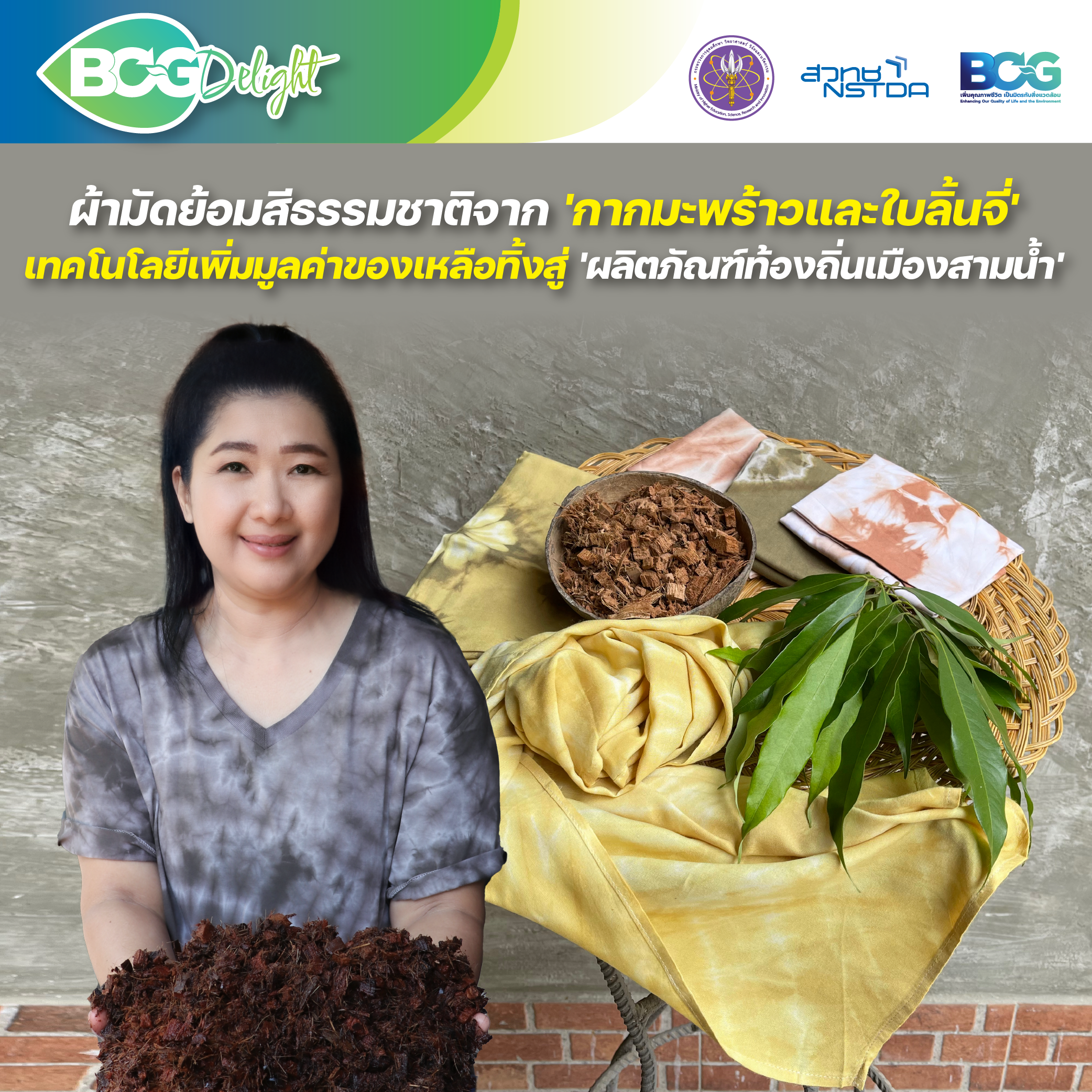 ผ้ามัดย้อมสีธรรมชาติจาก ‘เปลือกมะพร้าวและใบลิ้นจี่’ ใช้เทคโนโลยีเพิ่มมูลค่าของเหลือทิ้งสู่ ‘ผลิตภัณฑ์ท้องถิ่นเมืองสามน้ำ’