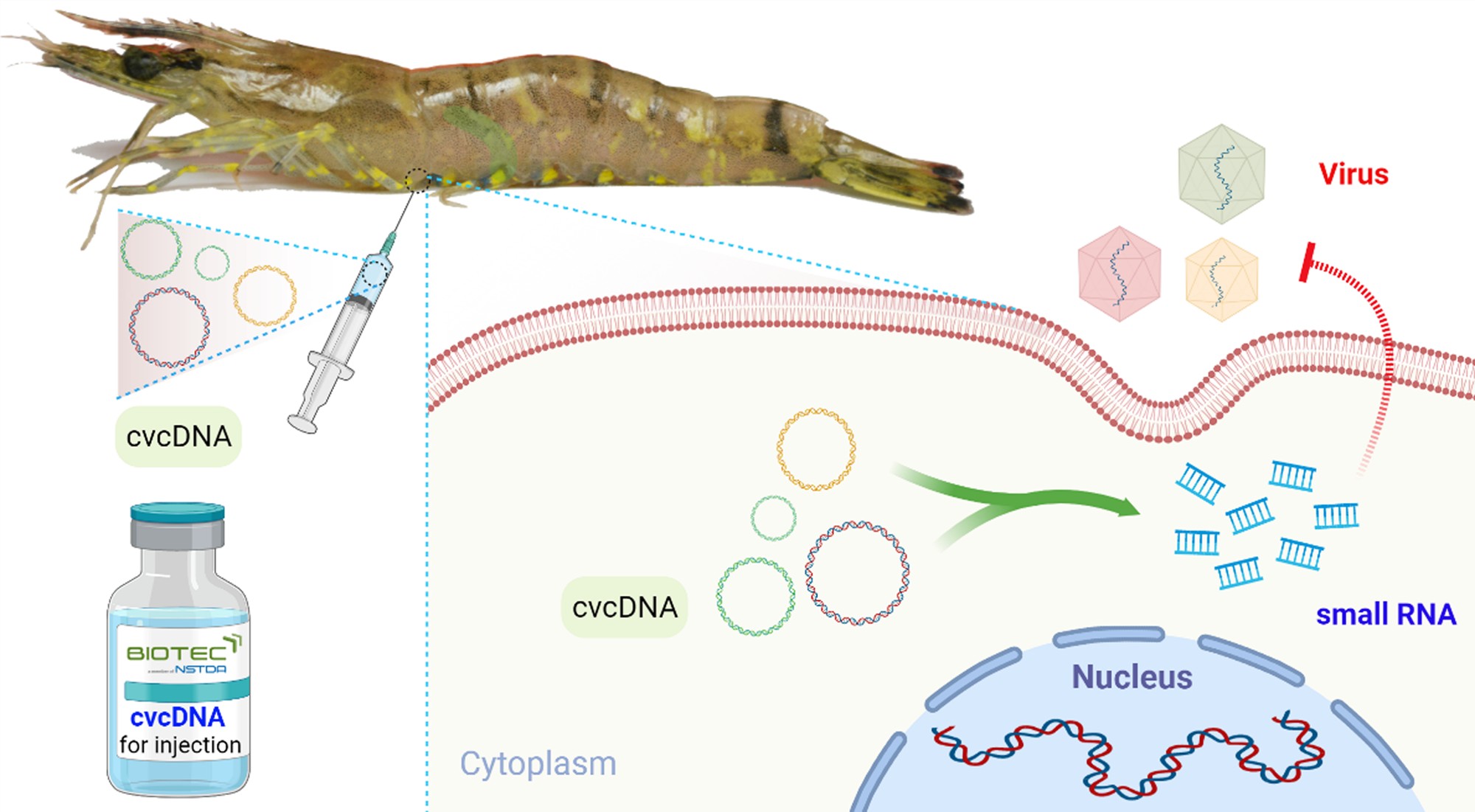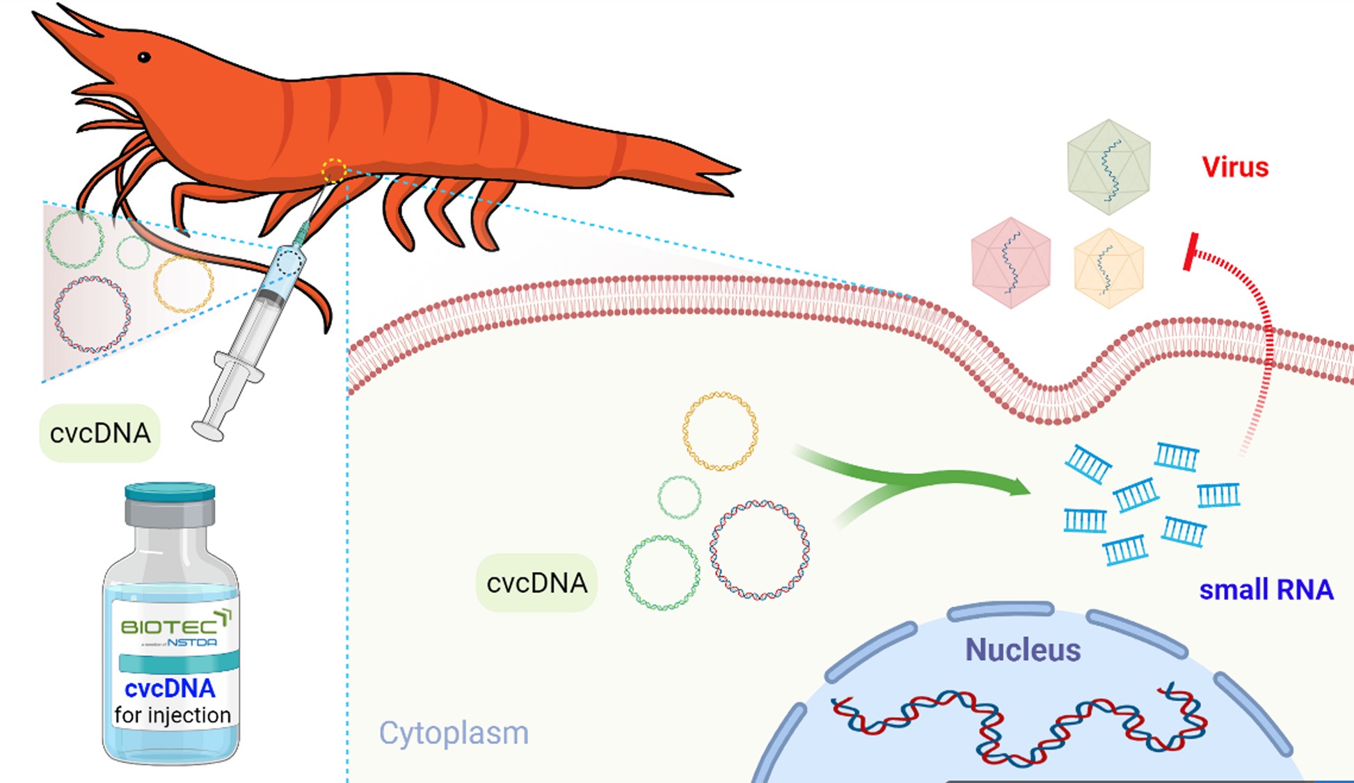 นักวิจัยไบโอเทค สวทช. และ มหาวิทยาลัยมหิดล ค้นพบแนวทางการผลิตวัคซีนในกุ้งทะเลจากองค์ความรู้เรื่อง cvcDNA ที่กุ้งสร้างเลียนแบบสารพันธุกรรมของไวรัส