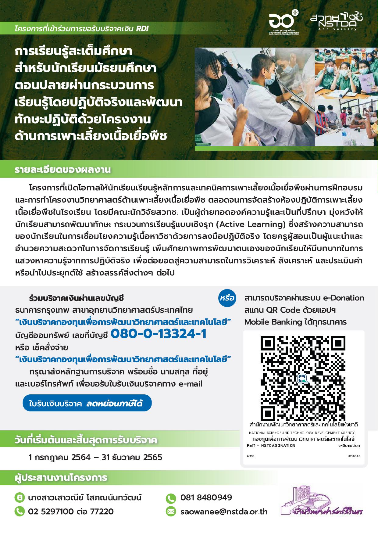 โดยบริจาคเงินเข้ากองทุนเพื่อการพัฒนาวิทยาศาสตร์และเทคโนโลยี เพื่อส่งเสริมการเรียนรู้สะเต็มศึกษา สำหรับนักเรียนมัธยมศึกษาตอนปลายผ่านกระบวนการเรียนรู้โดยปฏิบัติจริงและพัฒนาทักษะปฏิบัติด้านการเพาะเลี้ยงเนื้อเยื่อพืช โดยการบริจาคเข้ากองทุนเพื่อการพัฒนาวิทยาศาสตร์และเทคโนโลยี และใบรับเงินบริจาคสามารถนำไปลดหย่อนภาษีได้ 2 เท่า ตามพระราชกฤษฎีกา ฉบับที่ 717 ว่าด้วยการลดภาษีเงินบริจาคเข้ากองทุนเพื่อการพัฒนาวิทยาศาสตร์และเทคโนโลยี