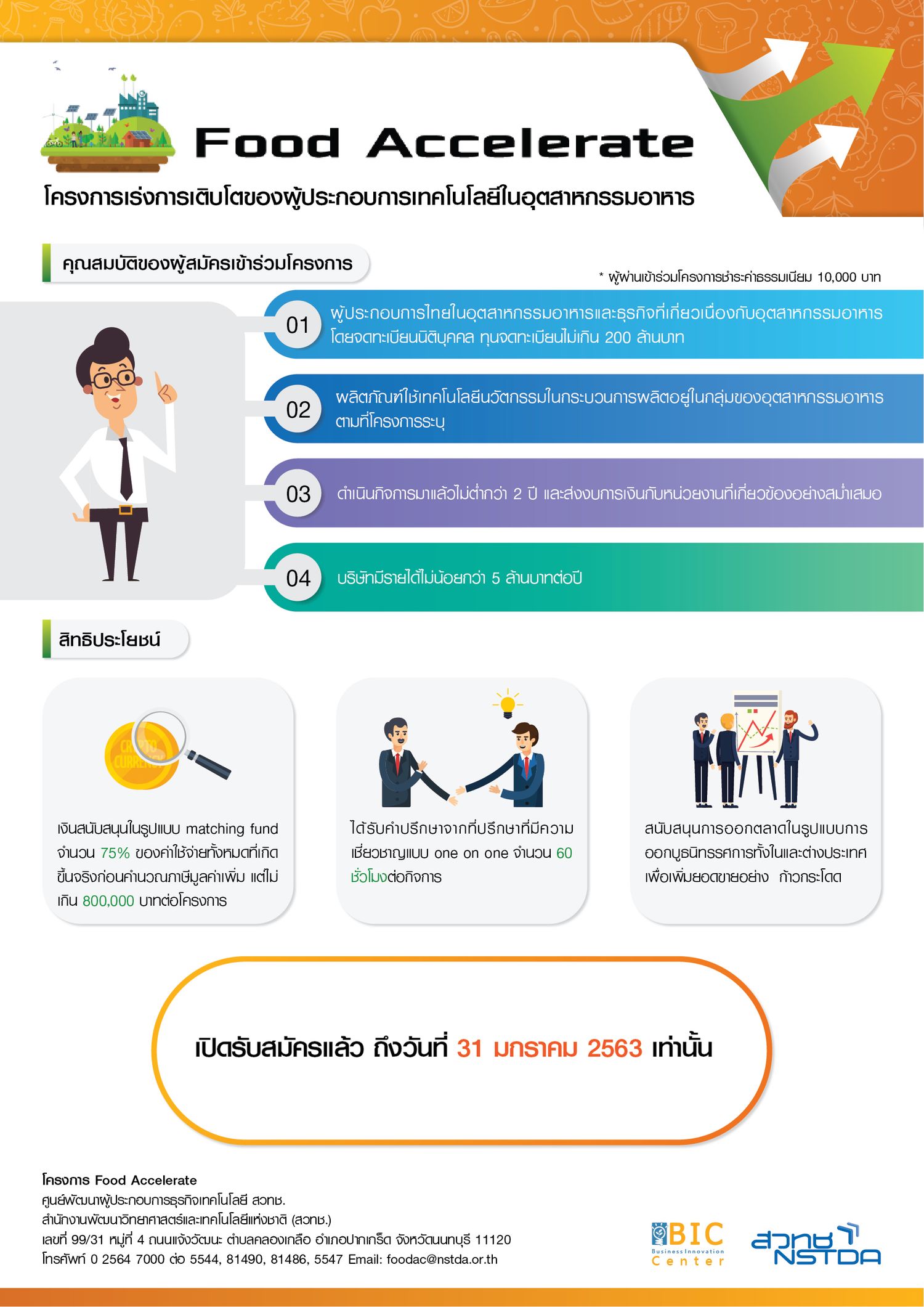 สำนักงานพัฒนาวิทยาศาสตร์และเทคโนโลยีแห่งชาติ (สวทช.) โดยศูนย์พัฒนาผู้ประกอบการธุรกิจเทคโนโลยี (BIC) ขอเชิญผู้ประกอบการกลุ่มอุตสาหกรรมอาหาร สมัครเข้าร่วม “โครงการเร่งการเติบโตของผู้ประกอบการเทคโนโลยีในอุตสาหกรรมอาหาร (Food Accelerate)” เพื่อเร่งการเติบโตทางธุรกิจอย่างก้าวกระโดด โดยเสริมสร้างศักยภาพของผู้ประกอบการเทคโนโลยีด้านนวัตกรรมอาหารที่มีมูลค่าสูง รวมถึงสร้าง platform เครือข่ายความร่วมมือและการเข้าถึงผู้เชี่ยวชาญ และเพิ่มขีดความสามารถการแข่งขันด้านการตลาดและโอกาสขยายธุรกิจ ซึ่ง สวทช. ให้การสนับสนุนผู้ประกอบการที่เข้าร่วมโครงการในลักษณะเงินสนับสนุนรูปแบบ matching fund ไม่เกิน 75% ของค่าใช้จ่ายที่เกิดขึ้นจริง ในวงเงินไม่เกิน 800,000 บาท (แปดแสนบาทถ้วน) มีระยะเวลาการสนับสนุนไม่เกิน 10 เดือน ตลอดจนได้รับคำปรึกษาจากผู้เชี่ยวชาญแบบตัวต่อตัว การออกตลาดในรูปแบบการออกบูธนิทรรศการทั้งในและต่างประเทศ