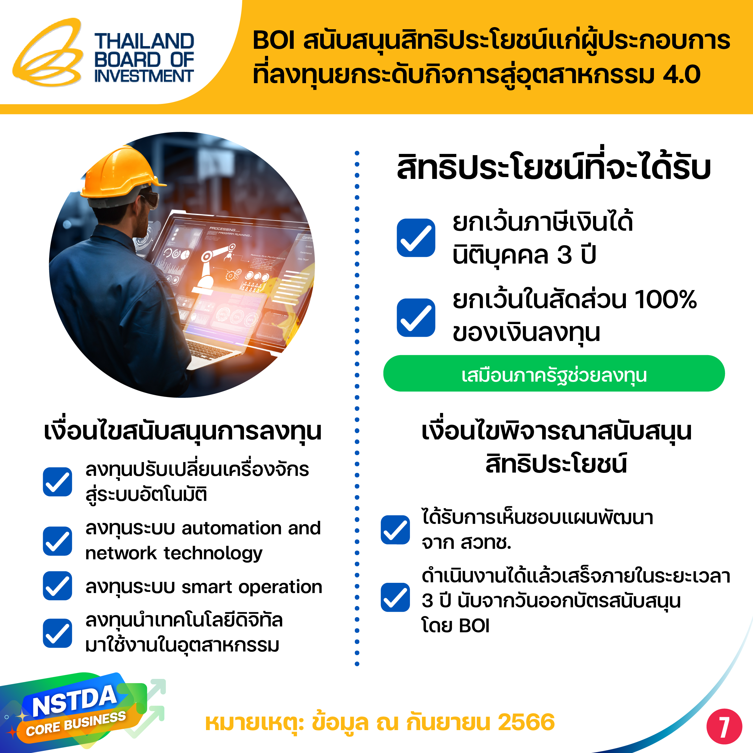 โดยผู้ประกอบการที่นำกิจการเข้ารับการประเมินด้วย ‘Thailand i4.0 index’ และได้รับการเห็นชอบแผนพัฒนาจาก สวทช. สามารถนำเอกสารรับรองยื่นขอรับการส่งเสริมจาก BOI เพื่อสิทธิประโยชน์ด้านการยกเว้นภาษีเงินได้ในสัดส่วน 100% ของเงินลงทุนเป็นเวลา 3 ปี ‘เปรียบเสมือนภาครัฐช่วยลงทุน’ (เงื่อนไขตามข้อกำหนดของ BOI)