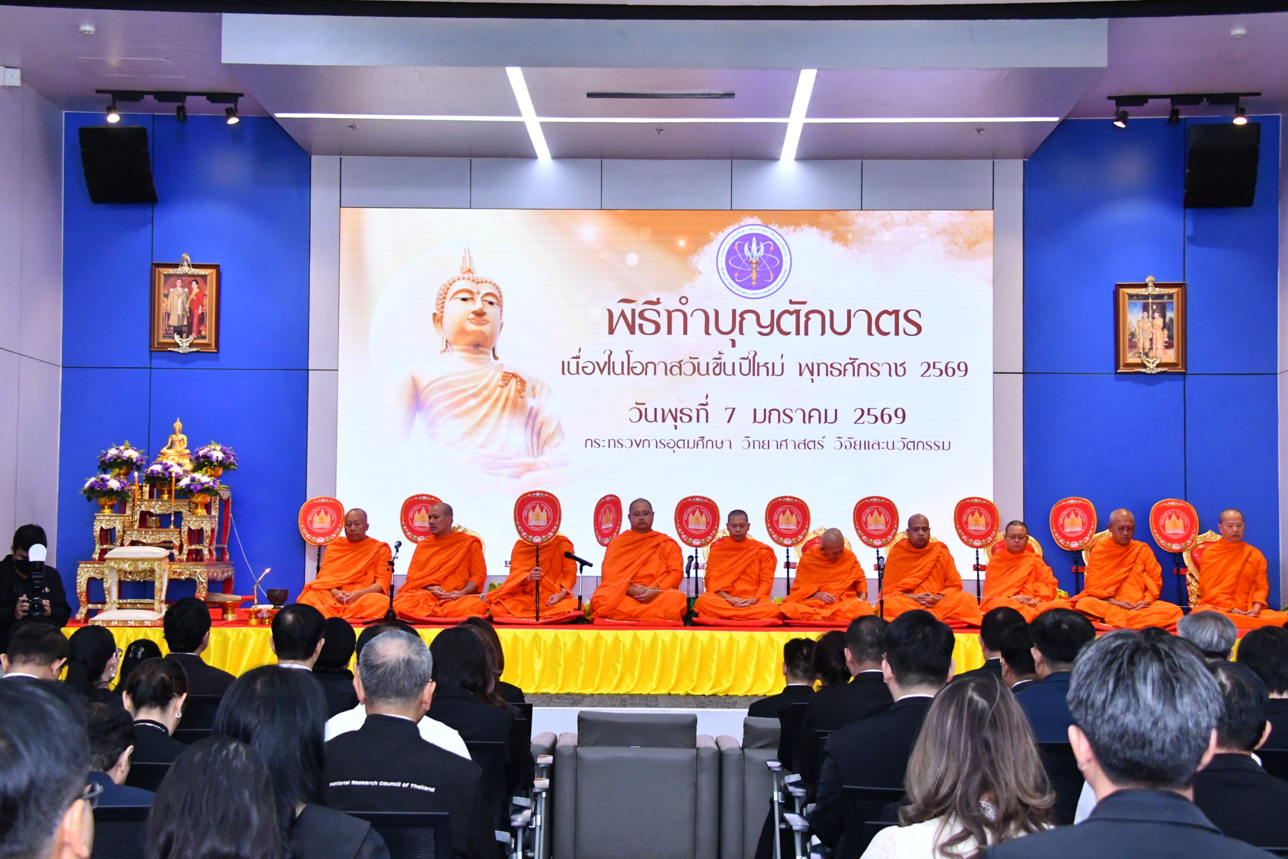 เมื่อวันที่ 7 มกราคม 2569 กระทรวงการอุดมศึกษา วิทยาศาสตร์ วิจัยและนวัตกรรม (อว.) ได้จัดกิจกรรมทำบุญตักบาตรเนื่องในโอกาสวันขึ้นปีใหม่ พุทธศักราช 2569 โดยได้รับเกียรติจากนายสุรศักดิ์ พันธ์เจริญวรกุล รัฐมนตรีว่าการกระทรวง อว. เป็นประธานในพิธี พร้อมด้วย นางสาวพิมพ์พร ชีวานันท์ เลขานุการรัฐมนตรีว่าการกระทรวง อว. ศ.ดร.ศุภชัย ปทุมนากุล ปลัดกระทรวง อว. นางสาววราภรณ์ รุ่งตระการ รองปลัดกระทรวง อว. ดร.พันธุ์เพิ่มศักดิ์ อารุณี รองปลัดกระทรวง อว. นายวันนี นนท์ศิริ หัวหน้าผู้ตรวจราชการกระทรวง อว. นางเพ็ญนภา กัญชนะ ผู้ตรวจราชการกระทรวง อว. ศาสตราจารย์ ดร.ชูกิจ ลิมปิจำนงค์ ผู้อำนวยการสำนักงานพัฒนาวิทยาศาสตร์และเทคโนโลยีแห่งชาติ (สวทช.) ดร.สมบุญ สหสิทธิวัฒน์ รองผู้อำนวยการ สวทช. ดร. ภญ.อุรชา รักษ์ตานนท์ชัย ผู้อำนวยการศูนย์นาโนเทคโนโลยีแห่งชาติ ดร.สิทธิโชค ตั้งภัสสรเรือง รองผู้อำนวยการไบโอเทค คณะผู้บริหาร ข้าราชการ และเจ้าหน้าที่ เข้าร่วมงานอย่างพร้อมเพรียง ณ อาคารพระจอมเกล้า (โยธี) สำนักงานปลัดกระทรวง อว.