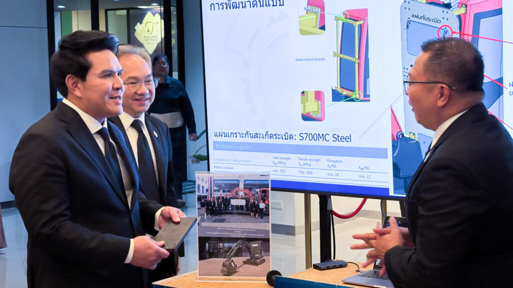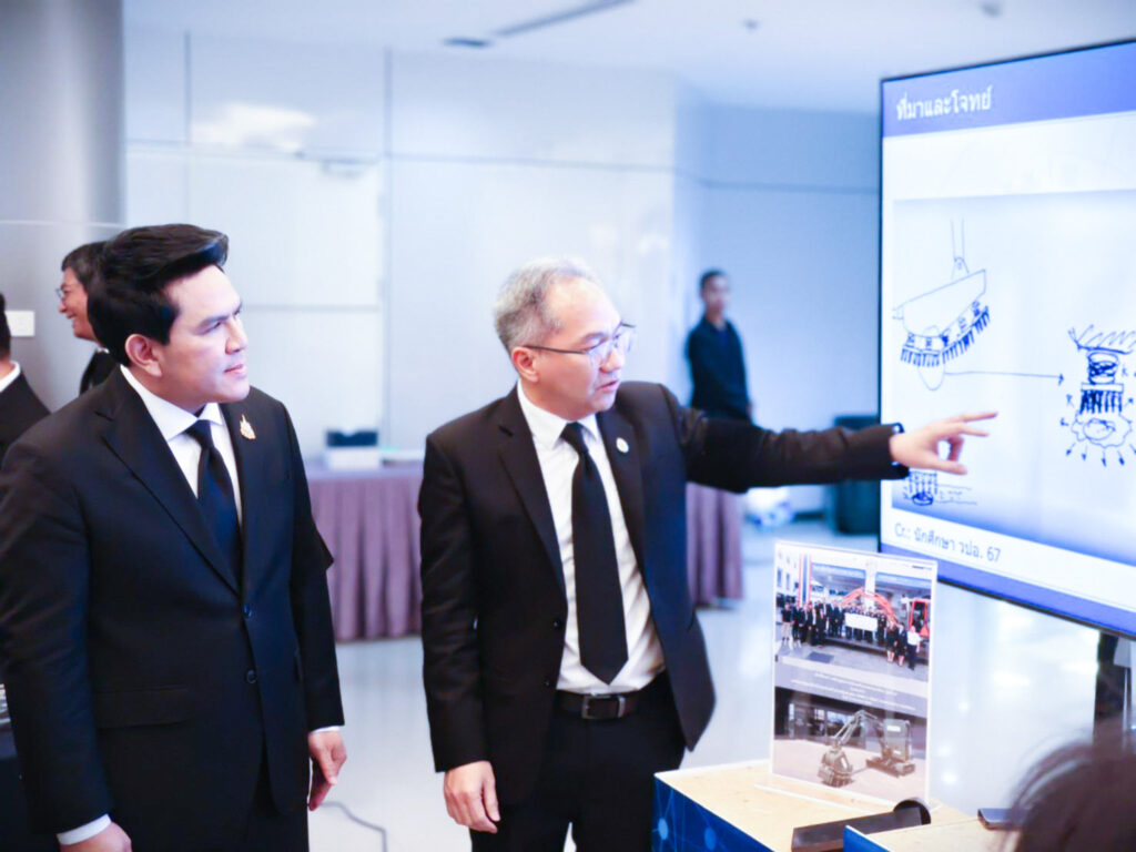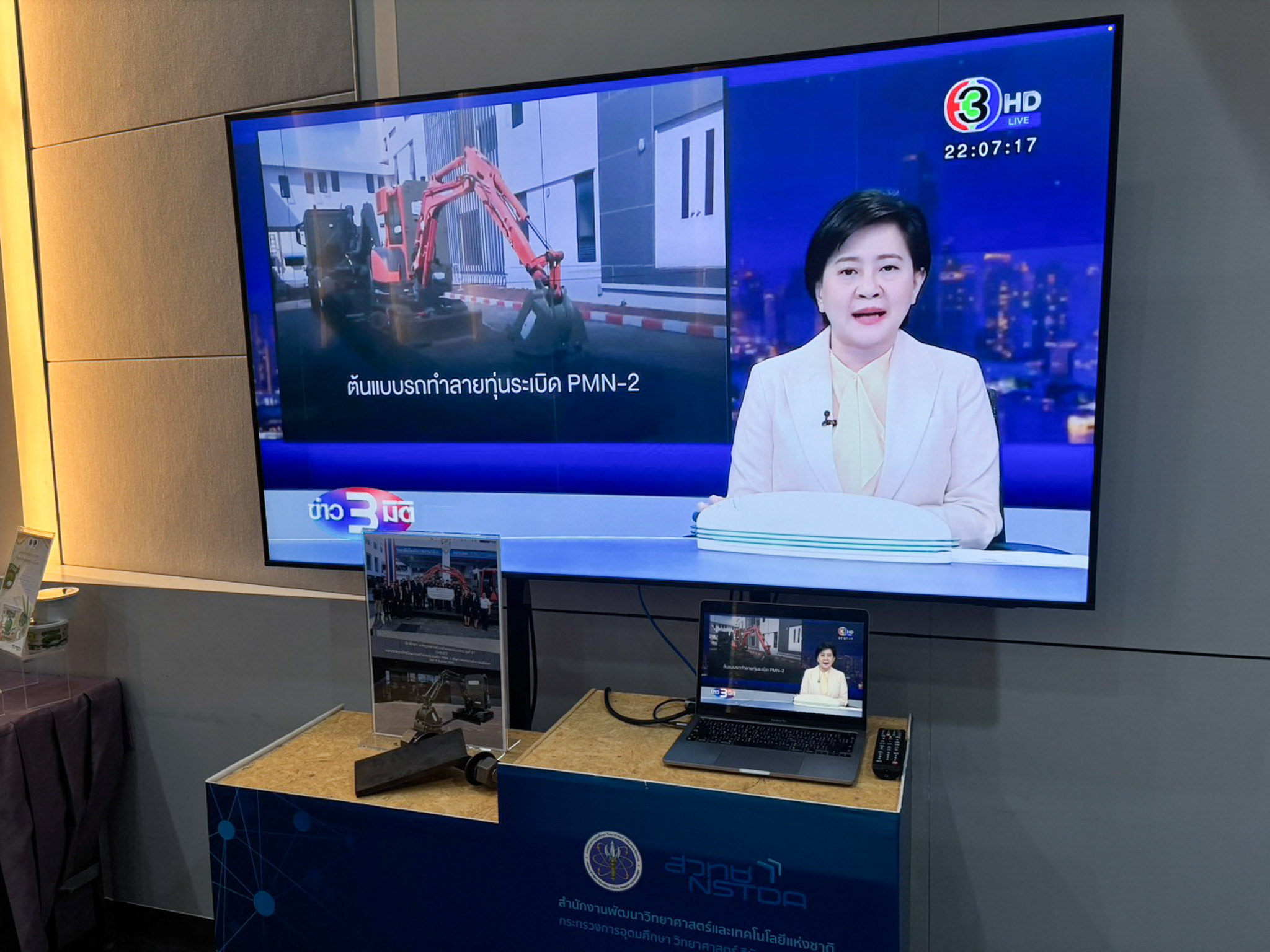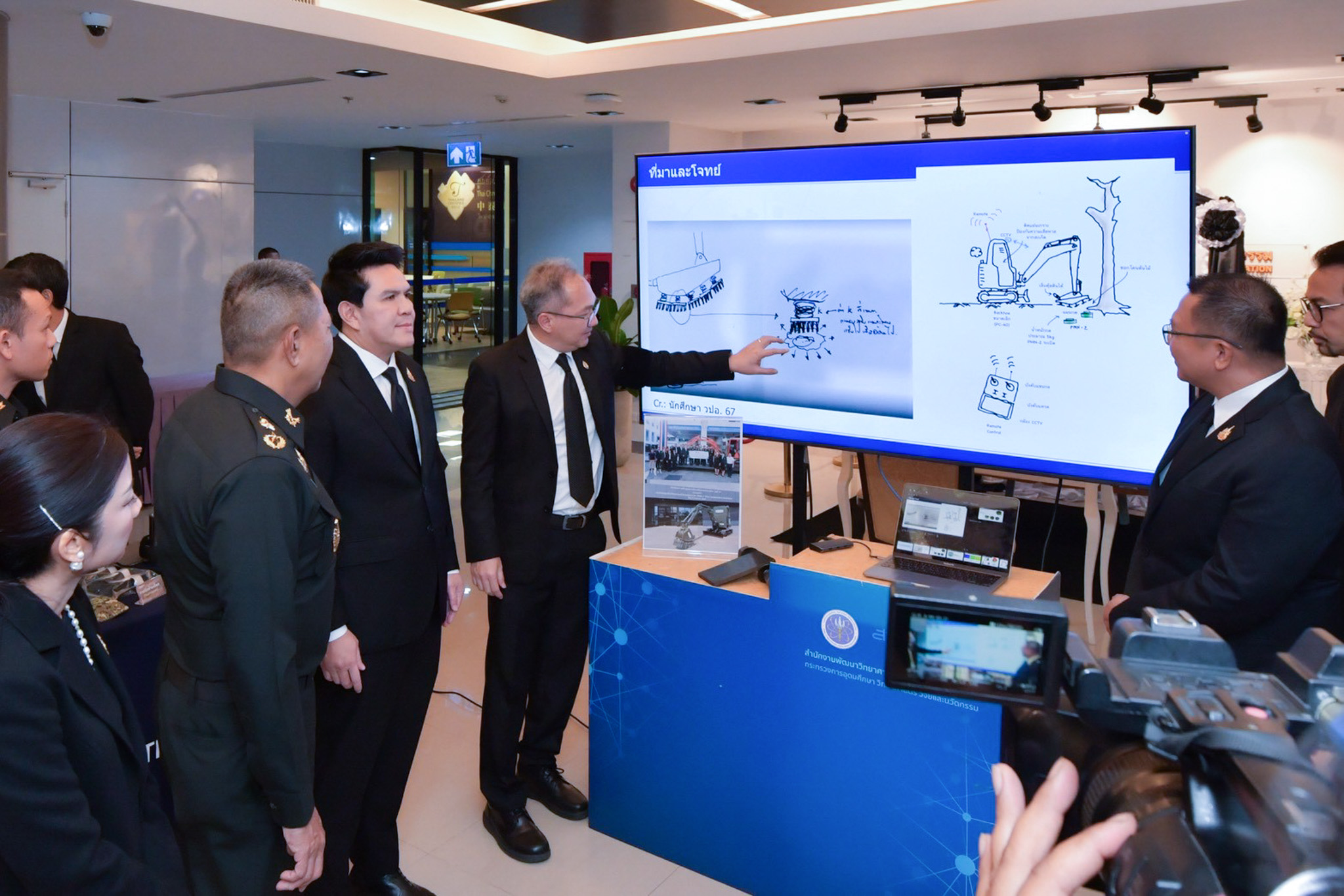 โอกาสนี้ ศาสตราจารย์ ดร.ชูกิจ ลิมปิจำนงค์ ผู้อำนวยการสำนักงานพัฒนาวิทยาศาสตร์และเทคโนโลยีแห่งชาติ (สวทช.) ได้นำเสนอนิทรรศการผลงาน “ต้นแบบรถขุดตักดัดแปลงทำลายทุ่นระเบิด PMN-2 สำหรับภูมิประเทศซับซ้อนสูงในพื้นที่ชายแดน” โดยก่อนหน้านี้เมื่อวันที่ 11 กันยายนที่ผ่านมาคณะนักศึกษา วิทยาลัยป้องกันราชอาณาจักร รุ่นที่ 67 หรือ วปอ.67 ได้ทำการส่งมอบ ต้นแบบรถขุดตักดัดแปลงทำลายทุ่นระเบิด PMN-2 ให้แก่ พล.ท.สิรภพ ศุภวานิช เจ้ากรมการทหารช่าง กองทัพบก เพื่อนำไปใช้ในภารกิจการป้องกันประเทศ