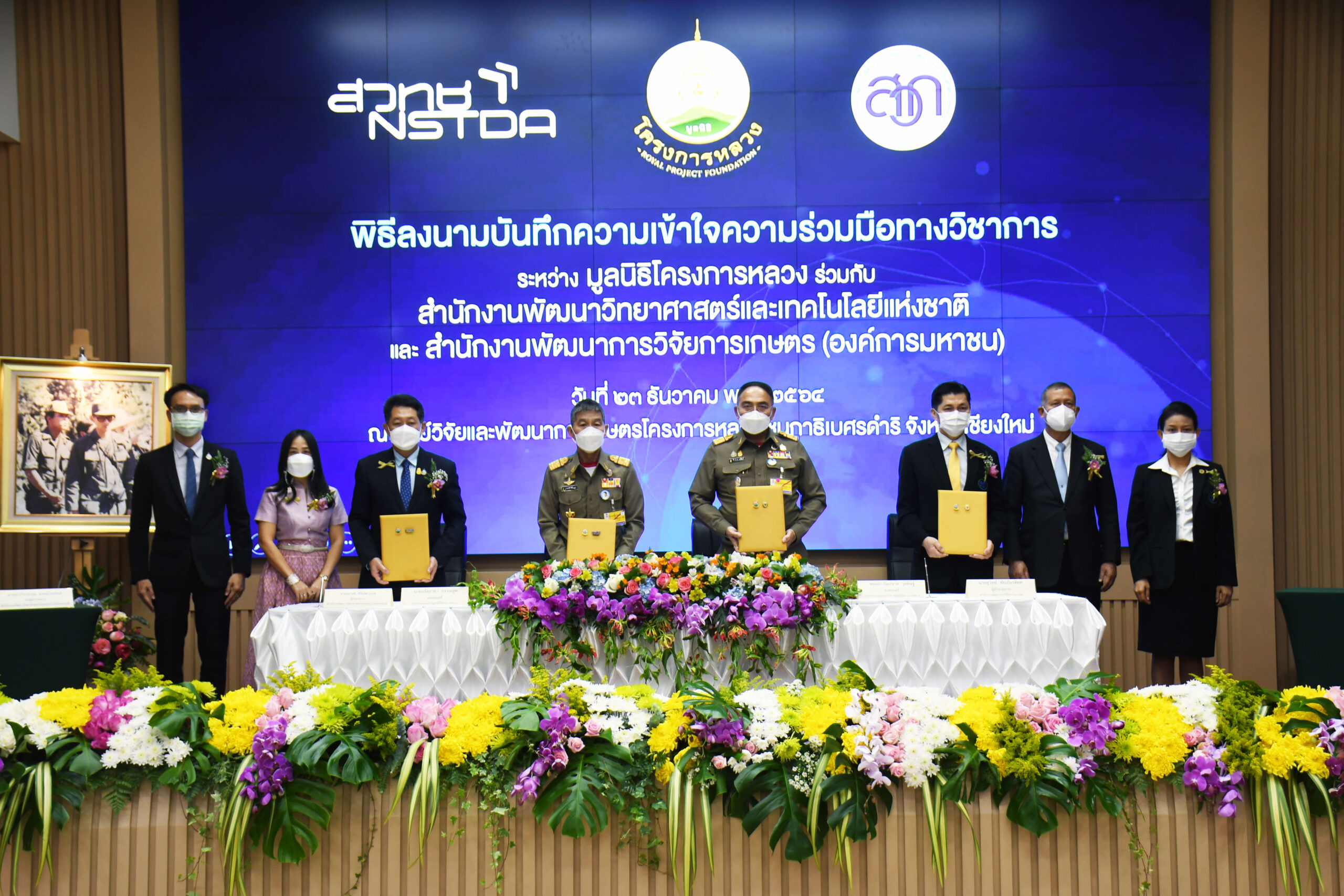 มูลนิธิโครงการหลวง และสำนักงานพัฒนาวิทยาศาสตร์และเทคโนโลยีแห่งชาติ (สวทช.) ลงนามบันทึกความร่วมมือ “การพัฒนางานวิจัยและการถ่ายทอดองค์ความรู้ด้านวิทยาศาสตร์ เทคโนโลยีและนวัตกรรม เพื่อพัฒนาอาชีพและยกระดับคุณภาพชีวิตในชุมชน” สอดคล้องตามแนวทางของมูลนิธิที่มุ่งให้ “เกษตรกรมีรายได้พอเพียง ชุมชนเข้มแข็ง ป่าต้นน้ำลำธารได้รับการฟื้นฟู”