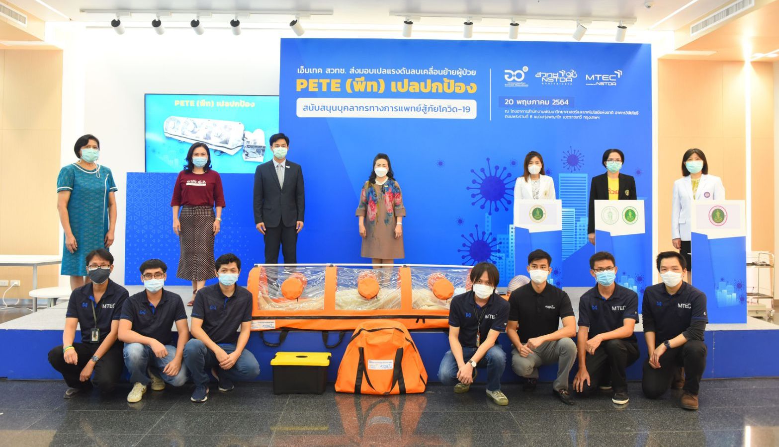 นำโดย ดร.จุลเทพ ขจรไชยกูล ผู้อำนวยการเอ็มเทค สวทช. นางกุลประภา นาวานุเคราะห์ ผู้ช่วยผู้อำนวยการ สวทช. พร้อมด้วยทีมวิจัยเอ็มเทค ได้แก่ ดร.ศราวุธ เลิศพลังสันติ และ ดร.ก่อเกียรติ เศษชัยชาญ ร่วมกันส่งมอบ PETE (พีท) เปลปกป้อง: เปลความดันลบเคลื่อนย้ายผู้ป่วยโควิด-19 จำนวน 3 ชุด และรถส่งของบังคับทางไกล “อารี” เพื่อบุคลากรทางการแพทย์ สำหรับใช้ขนส่งสัมภาระให้ผู้ป่วยโควิด-19 จำนวน 1 ชุด ให้แก่โรงพยาบาลและโรงพยาบาลสนาม สนับสนุนการปฏิบัติงานของบุคลากรทางการแพทย์เพื่อรับมือสถานการณ์การระบาดโรคโควิด-19