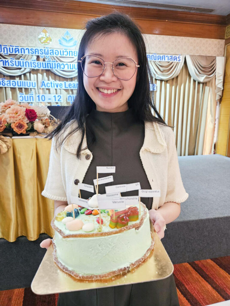 พญ.อติพรได้นำเสนอแนวทางการสอนเรื่อง “เซลล์และการแบ่งเซลล์” ผ่านการออกแบบโมเดลจากวัสดุและอาหารใกล้ตัว โดยใช้วัตถุที่มีพื้นผิวและรูปทรงแตกต่างกันแทนออร์แกเนลล์ และจัดวางส่วนประกอบเพื่อจำลองกระบวนการแบ่งเซลล์ เพื่อแสดงให้เห็นว่าเนื้อหาทางชีววิทยาที่มีความซับซ้อนเชิงนามธรรม สามารถทำให้เข้าใจได้ผ่านการลงมือปฏิบัติ การสัมผัส และการอภิปรายร่วมกันในชั้นเรียน