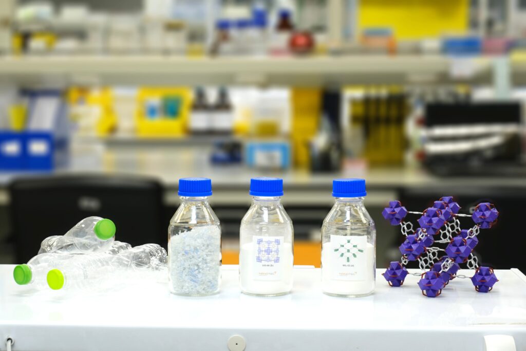 ตามมาด้วยวัสดุนาโนที่กำลังเป็นที่กล่าวถึงหลังคว้าโนเบลเคมี 2025 กับ “มอฟส์” (metal-organic frameworks: MOFs) ที่นาโนเทค สวทช. พัฒนาอย่างต่อเนื่อง หนึ่งในนั้นคือ การผลิต MOFs โดยใช้แนวคิดเศรษฐกิจหมุนเวียน เพื่อหมุนเวียนวัสดุเหลือใช้กลับมาใช้ประโยชน์ เช่น การย่อยสลายขวดน้ำดื่มพลาสติกเพื่อนำมาใช้แทนสารอินทรีย์ลิแกนด์ เป็นสารตั้งต้นสำคัญในการสังเคราะห์ MOFs หลายชนิดรวมถึงการสังเคราะห์ MOFs จากโลหะที่ได้จากของเสียอุตสาหกรรม เช่น mill scale จากอุตสาหกรรมเหล็ก และโลหะจากน้ำยากัดแผงวงจรพิมพ์ พร้อมออกแบบการขึ้นรูป MOFs ในหลากหลายรูปแบบเพื่อให้เหมาะสมกับการประยุกต์ใช้จริงในอุตสาหกรรม เช่น การขึ้นรูปเป็นเม็ด การเคลือบบนวัสดุรองรับ (support) และการขึ้นรูปเป็นเมมเบรนในลักษณะแผ่นหรือท่อกลวง ซึ่งช่วยให้ MOFs สามารถนำไปใช้งานได้สะดวก มีความทนทาน และมีประสิทธิภาพในการดูดซับหรือกรองสารปนเปื้อนได้ดียิ่งขึ้น ทั้งสำหรับดักจับก๊าซคาร์บอนไดออกไซด์, สารระเหยอินทรีย์ (VOC ) และไนโตรเจนออกไซด์ (NOx)ซึ่งเป็นก๊าซมลพิษสำคัญต่อสิ่งแวดล้อมและสุขภาพของมนุษย์ รวมถึง การดูดซับยาปฏิชีวนะ โลหะหนัก และการกำจัดสาร dichloroacetic acid (DCAA) เป็นต้น