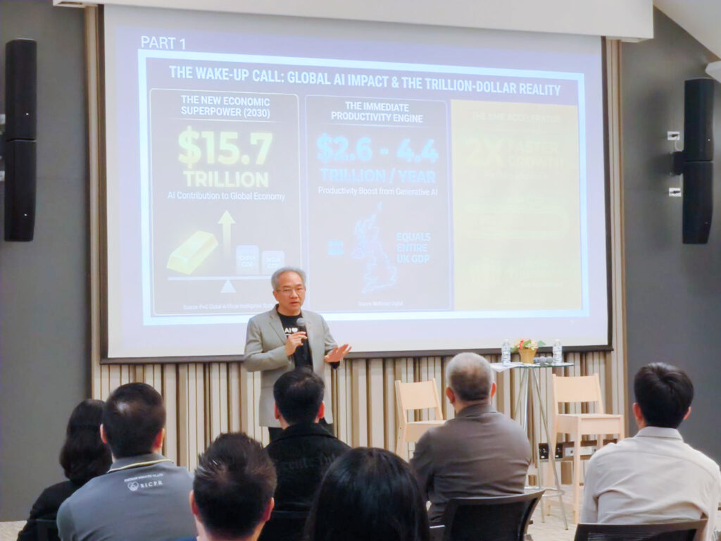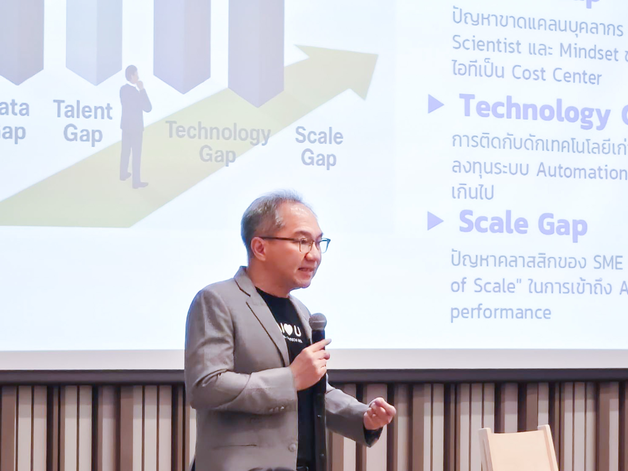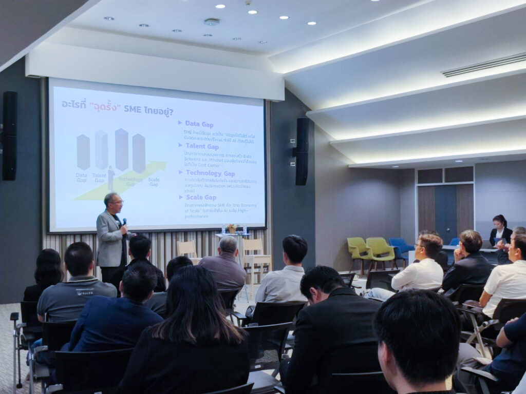 ผู้อำนวยการ สวทช. ได้ชี้ให้เห็นถึงจุดเปลี่ยนครั้งสำคัญของเศรษฐกิจโลกที่ขับเคลื่อนด้วย AI พร้อมเปิดแผนยุทธศาสตร์ปิดจุดอ่อนผู้ประกอบการไทย ด้วยโครงสร้างพื้นฐานและกลไกสนับสนุนที่รัฐลงทุนเตรียมพร้อมไว้ให้แล้ว ซึ่ง SME ที่ปรับตัวใช้ AI จะมีการเติบโตเร็วกว่าคู่แข่งถึง 2 เท่า และมีการจ้างงานเพิ่มขึ้น ในทางกลับกัน หากประเทศไทยไม่เร่งปิดช่องว่างทางเทคโนโลยี เราอาจเสียโอกาสมหาศาล โดยปัจจุบันดัชนีความพร้อมด้าน AI (Government AI Readiness Index 2023) ของไทยอยู่อันดับที่ 37 ของโลก และอันดับ 3 ของอาเซียน ซึ่งยังต้องเร่งพัฒนาโครงสร้างพื้นฐานข้อมูล (Data Infrastructure) เมื่อเทียบกับประเทศผู้นำอย่างสิงคโปร์
