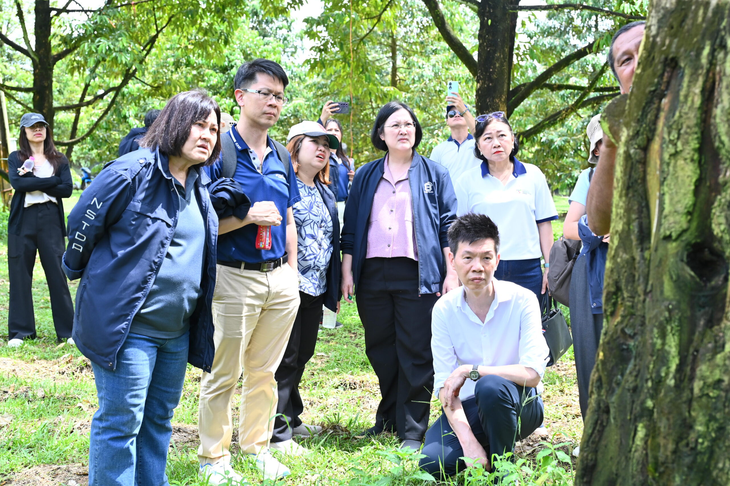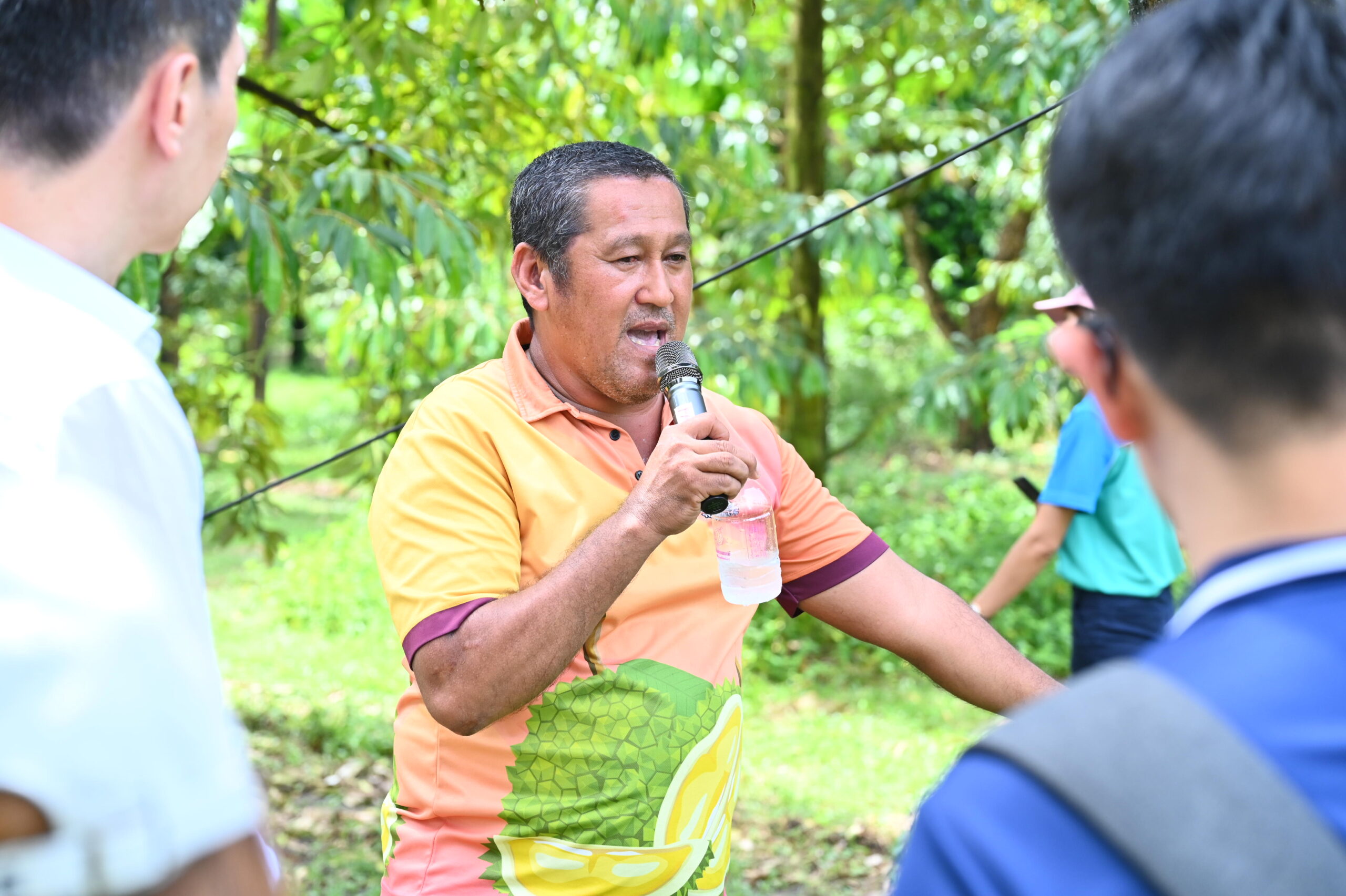 จากนั้น คณะฯ ได้เข้าเยี่ยมชม สวนผลไม้พรรณมณี ของคุณ มณี ภาระเปลื้อง ที่ ต.วังโตนด อ.นายายอาม จ.จันทบุรี เพื่อชมแปลงเรียนรู้การใช้ ไตรโคเดอร์มา TBRC 4734 จัดการ โรครากเน่าโคนเน่า ในทุเรียน ซึ่งร่วมถ่ายทอดเทคโนโลยีโดย สถาบันการจัดการเทคโนโลยีและนวัตกรรมเกษตร (สท.) สวทช. เพื่อให้เห็นภาพของการใช้ ชีวภัณฑ์ควบคุมโรคพืช ที่ช่วยให้ชาวสวนสามารถต่อสู้กับโรคสำคัญอย่างโรครากเน่า-โคนเน่าได้อย่างมีประสิทธิภาพ