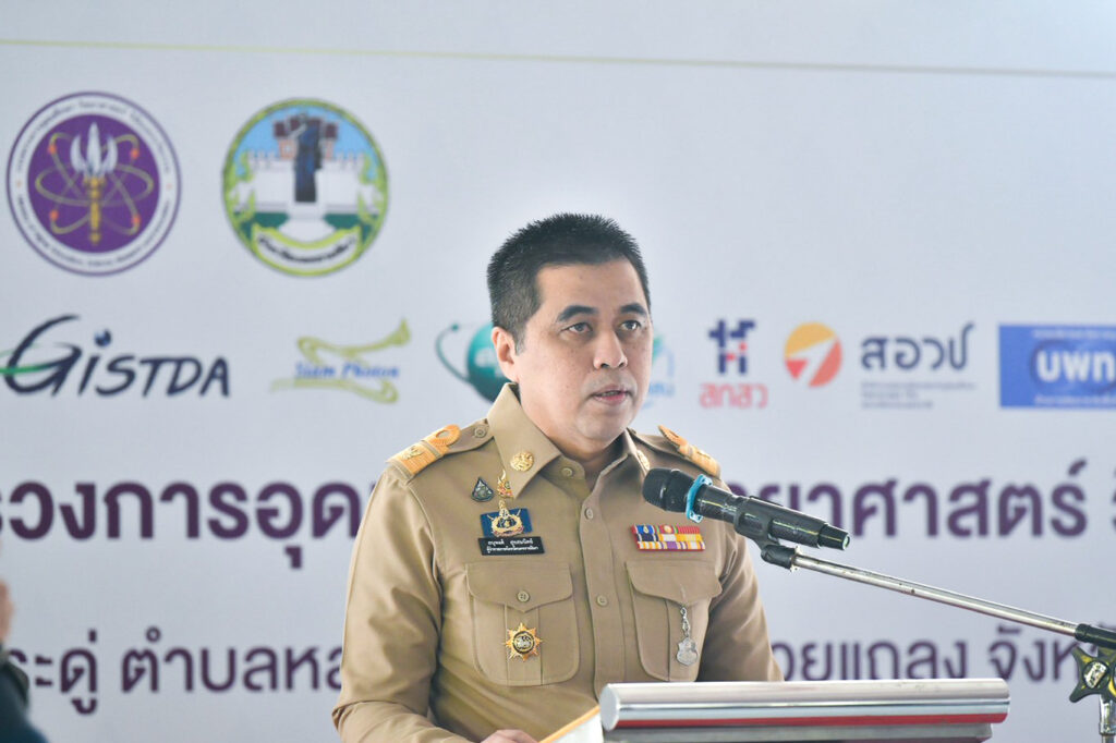 ภาพคณะผู้บริหารกระทรวง อว. และ สวทช. ลงพื้นที่จังหวัดนครราชสีมาถ่ายภาพหมู่  (15 ธันวาคม 2568) ณ จังหวัดนครราชสีมา : ศาสตราจารย์ ดร.ศุภชัย ปทุมนากุล ปลัดกระทรวงการอุดมศึกษา วิทยาศาสตร์ วิจัยและนวัตกรรม (อว.) และ น.ส.วราภรณ์ รุ่งตระการ รองปลัด อว. นายพันธุ์เพิ่มศักดิ์ อารุณี รักษาการรองปลัด อว. คณะผู้บริหาร หน่วยงานในสังกัด พร้อมด้วย ศาสตราจารย์ ดร.ชูกิจ ลิมปิจำนงค์ ผู้อำนวยการสำนักงานพัฒนาวิทยาศาสตร์และเทคโนโลยีแห่งชาติ (สวทช.) ร่วมลงพื้นที่ติดตามการดำเนินงานของกระทรวง อว. ณ อำเภอห้วยแถลง และอำเภอจักราช จังหวัดนครราชสีมา  ได้แก่ การเยี่ยมชมการขับเคลื่อนงานด้าน อววน. ยกระดับคุณภาพชีวิต  ผ่านนิทรรศการนวัตกรรมการพัฒนาผลิตภัณฑ์  การยกระดับเกษตรอัจฉริยะ  และหน่วยให้บริการประชาชนด้านการตรวจสุขภาพ  โดยมีนายอนุพงศ์ สุขสมนิตย์ ผู้ว่าราชการจังหวัดนครราชสีมาและหน่วยงานในพื้นที่ให้การต้อนรับ