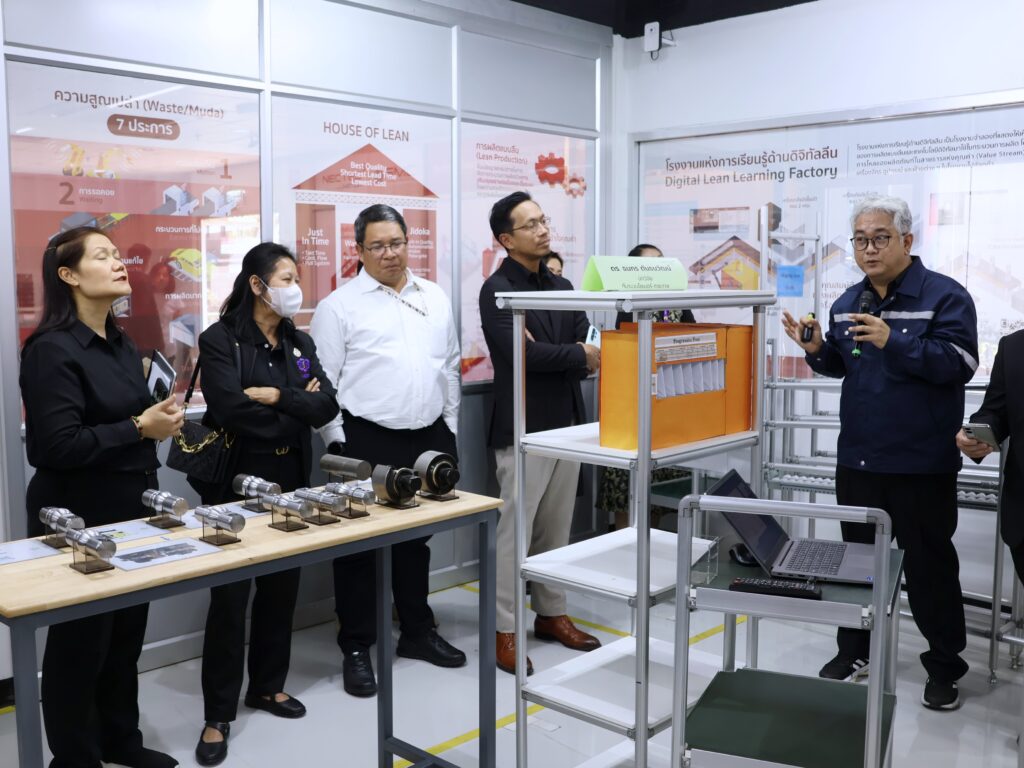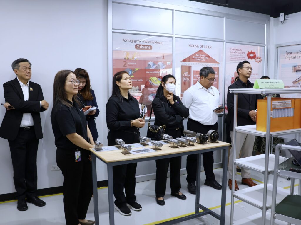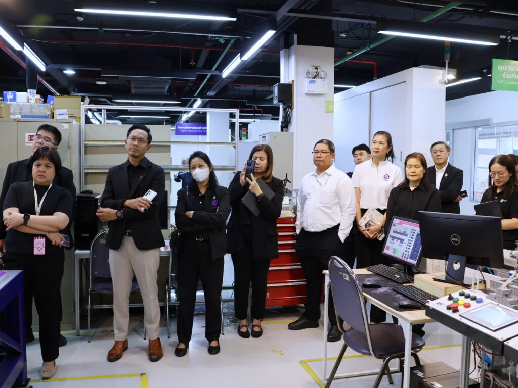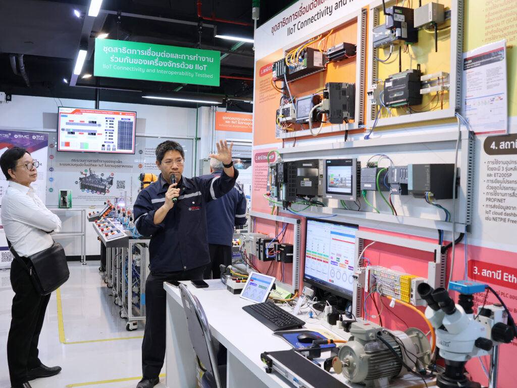 นอกจากนี้ คณะยังได้เยี่ยมชม Testbed ของศูนย์นวัตกรรมการผลิตยั่งยืน (SMC) ณ โรงงานต้นแบบ NECTEC ซึ่งเป็นโรงงานจำลองเพื่อการเรียนรู้และทดสอบเทคโนโลยี Industry 4.0 อาทิ Digital Lean Learning Factory โรงงานจำลองที่สะท้อนสภาพแวดล้อมการผลิตจริง ระบบ IIoT Connectivity and Interoperability Testbed ระบบอัตโนมัติในโรงงานด้วย PLC และหุ่นยนต์ Collaborative Robots (COBOT) รวมถึง Testbed สำหรับการตรวจจับความผิดปกติของมอเตอร์และระบบส่งกำลัง เพื่อสนับสนุนการพัฒนาระบบการผลิตอัจฉริยะของผู้ประกอบการไทย โดยมี ดร.เอกชาติ หัตถา, ดร.ธีรเชษฐ์ สูรพันธุ์, คุณชำนาญ ปัญญาใส, คุณสุรพันธ์ ทองรังสี นักวิจัยทีมระบบไซเบอร์-กายภาพ (CPS) NECTEC ร่วมนำเสนอผลงาน