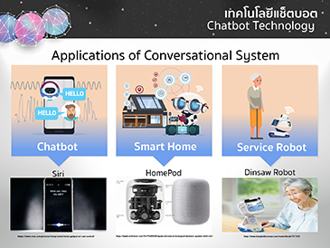 เทคโนโลยีแบบนี้มีหลายรูปแบบ เช่น ใช้ทำแช็ตบอตสำหรับบริการลูกค้า (Customer Service Chatbot) เช่น Line@ และ Siri และ Echo ระบบในหุ่นยนต์ดูแลผู้สูงอายุ เช่น หุ่นยนต์ดินสอ ทั้งนี้หน่วยวิจัยวิทยาการสื่อสารของมนุษย์และคอมพิวเตอร์ (HCCRU) ศูนย์เนคเทค สวทช. ทำวิจัยส่วนประกอบต่างๆ ที่กล่าวมาแล้ว 20 ปีต่อเนื่อง ปัจจุบันมีระบบรู้จำเสียงพูดภาษาไทยที่รองรับคำศัพท์หลากหลาย มีระบบจัดการการสนทนา และระบบสังเคราะห์เสียงพูดที่เป็นธรรมชาติ และร่วมกับพันธมิตรเพื่อประยุกต์ใช้ในงานบริการลูกค้าแบบเฉพาะด้านอีกด้วย