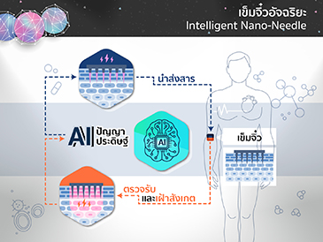 หลายคนคงรู้จักเข็มจิ๋วจิ้มไม่เจ็บ หรือ Nano Needle ที่อาศัยลักษณะของเข็มที่เล็กมาก ทำให้เวลาใช้งาน ผู้ที่ถูกเข็มเหล่านี้จิ้มจะไม่รู้สึกเจ็บ แต่เข็มเหล่านี้สามารถพัฒนาให้ฉลาดมากขึ้นและทำงานได้อเนกประสงค์ เช่น การเชื่อมต่อกับตัวรับสัญญาณ หรือ sensor ทำให้สามารถตรวจวัดการทำงานระบบต่างๆ ของร่างกายตามเวลาจริง (real time) ได้ เพื่อให้เห็นภาพ เช่น ผู้ป่วยโรคเบาหวานหรือผู้ที่มีความเสี่ยงจะเป็นโรคนี้ ที่ต้องการตรวจวัดระดับน้ำตาลอยู่ตลอดเวลา เพราะการเพิ่มระดับน้ำตาลในเลือดอย่างกะทันหัน อาจก่ออันตรายร้ายแรงได้ ก็อาจต้องอาศัยเข็มแบบนาโนนี้แปะติดกับผิวหนังไว้ เข็มจิ๋วอัจฉริยะจึงไม่ได้ทำหน้าที่เป็นแค่เข็มฉีดยา แต่กลายเป็น “ชุดวัดระดับน้ำตาล” ไปด้วยในตัว
