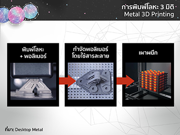 ปัจจุบันการพิมพ์โลหะ 3 มิติ มีการใช้เลเซอร์ (Laser) หรือลำแสงอิเล็กตรอน (Electron Beam) หลอมละลายผงโลหะเป็นชั้นๆ ชิ้นงานที่ได้มีความแข็งแรง ตกแต่งเพียงเล็กน้อยก็ใช้งานได้ทันที ด้วยเทคโนโลยีที่เบ็ดเสร็จในตัวเช่นนี้ คาดการณ์ว่าภายในไตรมาสที่ 3 ของปี 2562 จะมีเครื่องพิมพ์โลหะ 3 มิติ ไว้ใช้ตามออฟฟิศมากขึ้น โดยใช้วิธีพิมพ์แบบดันวัสดุ (Material Extrusion) ผงโลหะที่ผสมกับพอลิเมอร์จะถูกดันผ่านหัวฉีดขึ้นมาเป็นชั้นๆ โดยไม่ต้องใช้เลเซอร์หรือลำแสงอิเล็กตรอน และไม่มีผงโลหะส่วนเกิน ทำให้วางเครื่องประเภทนี้ในออฟฟิศได้เลย จุดเด่นคือพิมพ์ได้รวดเร็วขึ้น ราคาเครื่องพิมพ์ถูกลงโดยเฉพาะเพื่อพิมพ์ชิ้นส่วนโลหะ ที่ไม่ต้องการการผลิตจำนวนมากแต่ต้องมีความจำเพาะเจาะจง เช่น ในทางการแพทย์ ปัจจุบัน เอ็มเทค สวทช. ร่วมกับภาคเอกชนทำงานวิจัยที่ประยุกต์ใช้การพิมพ์โลหะ 3 มิติ เพื่อตอบโจทย์อุตสาหกรรม ทั้งวิธีการพิมพ์ที่ใช้เลเซอร์ หรือลำแสงอิเล็กตรอน และวิธีการพิมพ์ที่ต้องนำชิ้นงานไปเผาผนึกก่อนการใช้งาน
