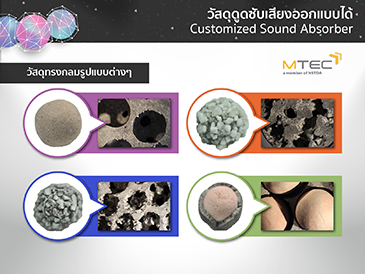 ปัญหาเสียงดังจากยานพาหนะ เครื่องมือ เครื่องจักร ก่อให้เกิดผลกระทบต่อสุขภาพทั้งทางร่างกายและจิตใจของผู้ที่อยู่ใกล้เคียง “โฟมอะลูมิเนียม” เป็นวัสดุที่มีคุณสมบัติในด้านการดูดซับเสียงได้ดี แข็งแรง ทนแรงกระแทก น้ำหนักเบา สวยงาม ไม่ลุกติดไฟ และไม่เป็นพิษต่อสิ่งแวดล้อม ปัจจุบันนักวิจัยจากห้องปฏิบัติการโลหะวิทยาขั้นสูง หน่วยวิจัยโลหะ ศูนย์เทคโนโลยีโลหะและวัสดุแห่งชาติ (เอ็มเทค) สวทช. พัฒนาโฟมอะลูมิเนียมที่มีคุณสมบัติเด่น คือ ดูดซับเสียงที่ความถี่เสียงต่างๆ ได้ตามความต้องการของผู้ใช้งาน ออกแบบโดยใช้วัสดุทรงกลมซึ่งสามารถทนอุณหภูมิสูง และมีพื้นผิวรูปแบบต่างๆ เป็นวัสดุที่ทำให้เกิดรูพรุนรูปแบบต่างๆ ภายในโฟมอะลูมิเนียมด้วย โดยผลทดสอบในห้องปฏิบัติการสามารถลดระดับเสียงดังลงได้จาก 90 เดซิเบล เป็น 64 เดซิเบล (การฟังเสียงดังระดับ 85 เดซิเบล ต่อเนื่องเป็นเวลานานอาจทำให้การรับฟังเสียงบกพร่องอย่างถาวรได้) วิธีการดังกล่าวมีต้นทุนการผลิตต่ำกว่าแบบเดิมถึง 50 % ช่วยลดการนำเข้าจากต่างประเทศได้อีกด้วย