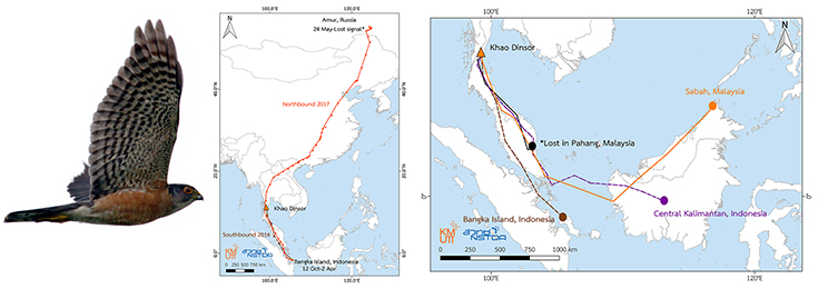 ในส่วนของเหยี่ยวนกเขาพันธุ์ญี่ปุ่นนั้น ทีมวิจัยสามารถติดตามสัญญาณไปถึงพื้นที่ของเกาะสุมาตรา และบอร์เนียว ซึ่งเป็นพื้นที่อาศัยในช่วงฤดูหนาวและใช้เวลาบริเวณนี้ประมาณ 130-170 วัน ก่อนที่จะอพยพกลับขึ้นทางเหนือ แต่เป็นที่น่าเสียดายที่ทีมวิจัยสามารถรับสัญญาณจากเหยี่ยวนกเขาพันธุ์ญี่ปุ่นได้เพียง 1 ตัวเท่านั้น ในช่วงอพยพกลับ โดยเหยี่ยวตัวนี้เดินทางออกจากพื้นที่อาศัยบนเกาะ Bangka ประเทศอินโดนีเซีย ไปยังพื้นที่ผสมพันธุ์ในเขตอามูร์ (Amur) ทางตะวันออกของประเทศรัสเซีย ก่อนที่สัญญาณจะขาดหายไป ทำให้สรุปรวมระยะทางอพยพได้ทั้งสิ้น 7,699 กม. ใช้เวลาเดินทางทั้งสิ้นประมาณ 50 วัน”