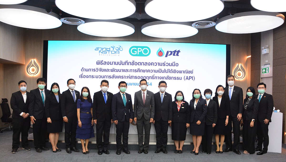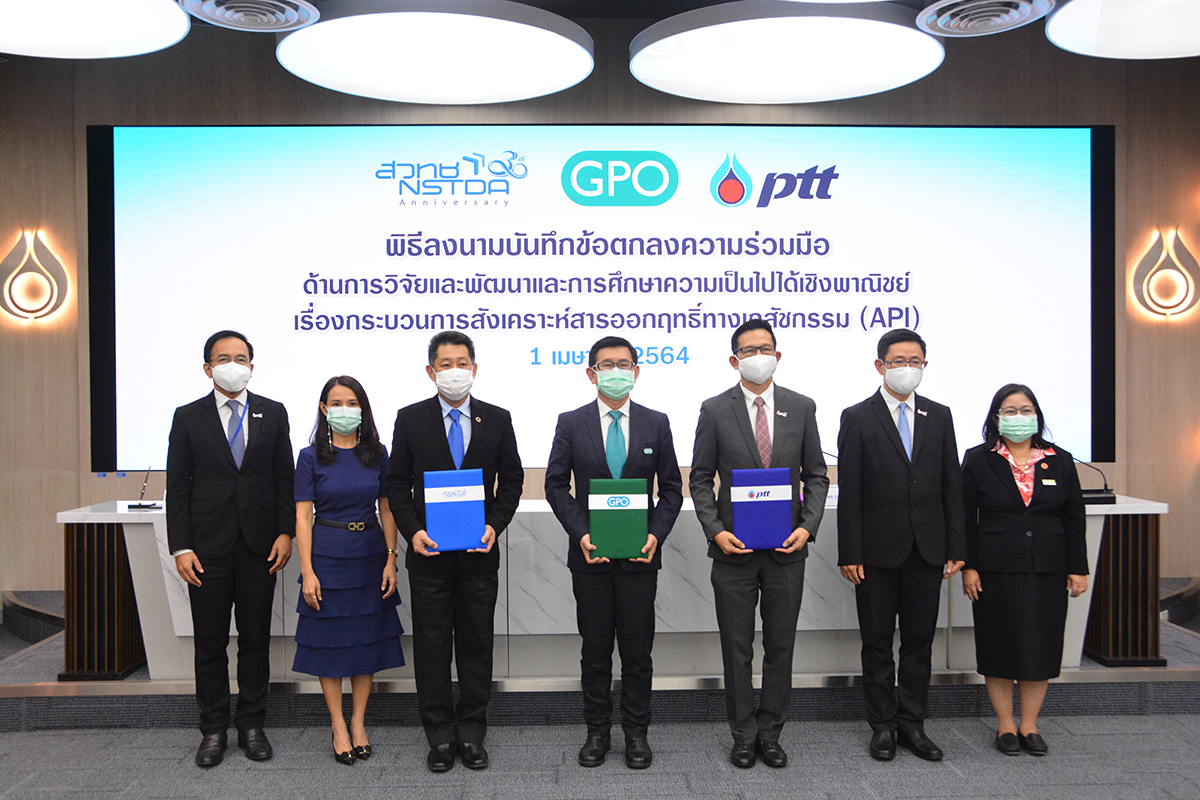 ดร.ณรงค์ ศิริเลิศวรกุล ผู้อำนวยการ สำนักงานพัฒนาวิทยาศาสตร์และเทคโนโลยีแห่งชาติ (สวทช.) พร้อม นายแพทย์วิฑูรย์ ด่านวิบูลย์ ผู้อำนวยการ องค์การเภสัชกรรม (อภ.) และ นายอรรถพล ฤกษ์พิบูลย์ ประธานเจ้าหน้าที่บริหารและกรรมการผู้จัดการใหญ่ บริษัท ปตท. จำกัด (มหาชน) (ปตท.) ร่วมลงนามบันทึกข้อตกลงความร่วมมือด้านการวิจัยและพัฒนา “กระบวนการสังเคราะห์สารออกฤทธิ์ทางเภสัชกรรม (Active Pharmaceutical Ingredients; API) และ ศึกษาความเป็นไปได้ในเชิงพาณิชย์ และ/หรือการสร้างความมั่นคงทางยาให้แก่ประเทศไทย” ณ บริษัท ปตท. จำกัด (มหาชน) สำนักงานใหญ่.