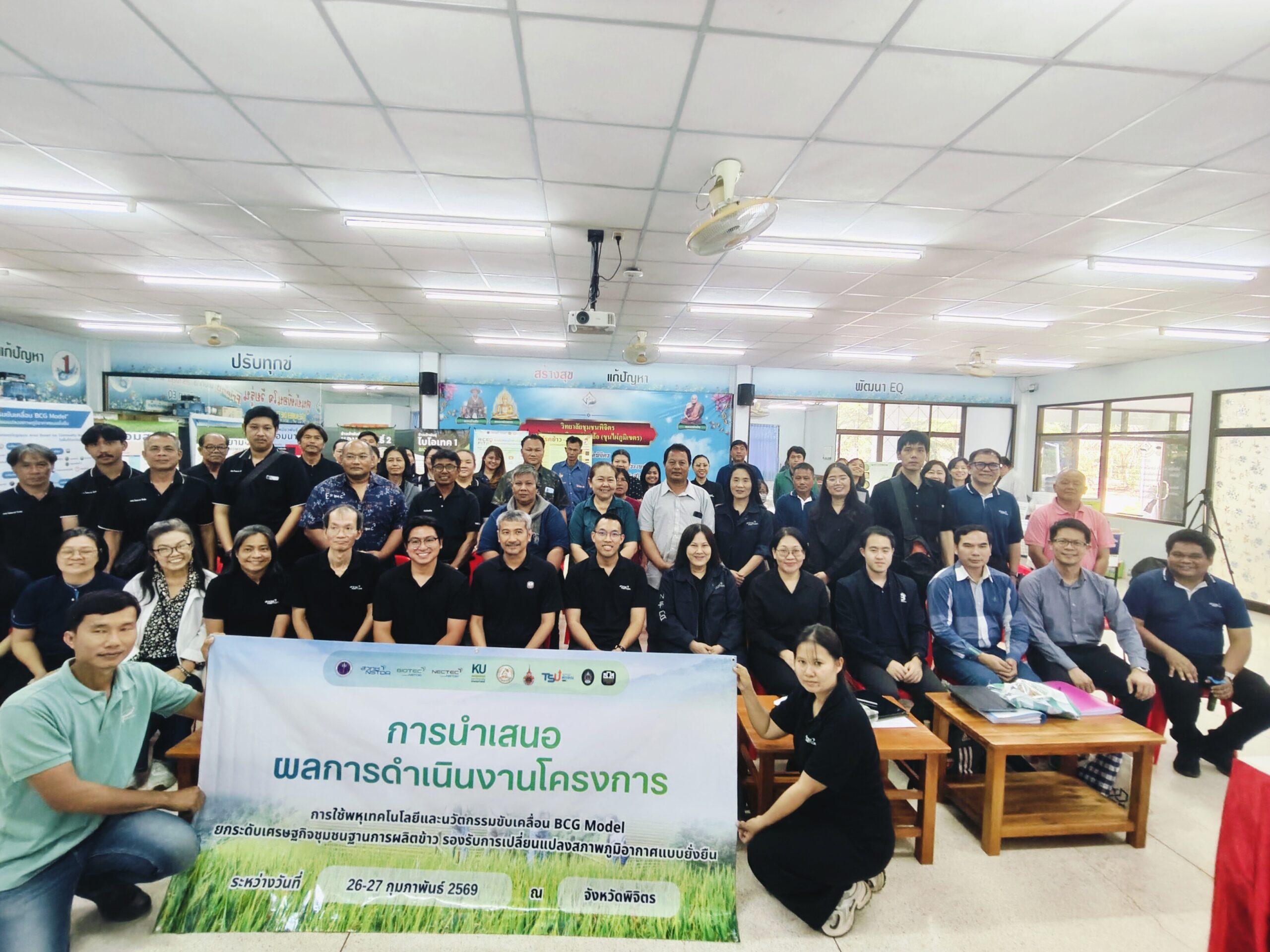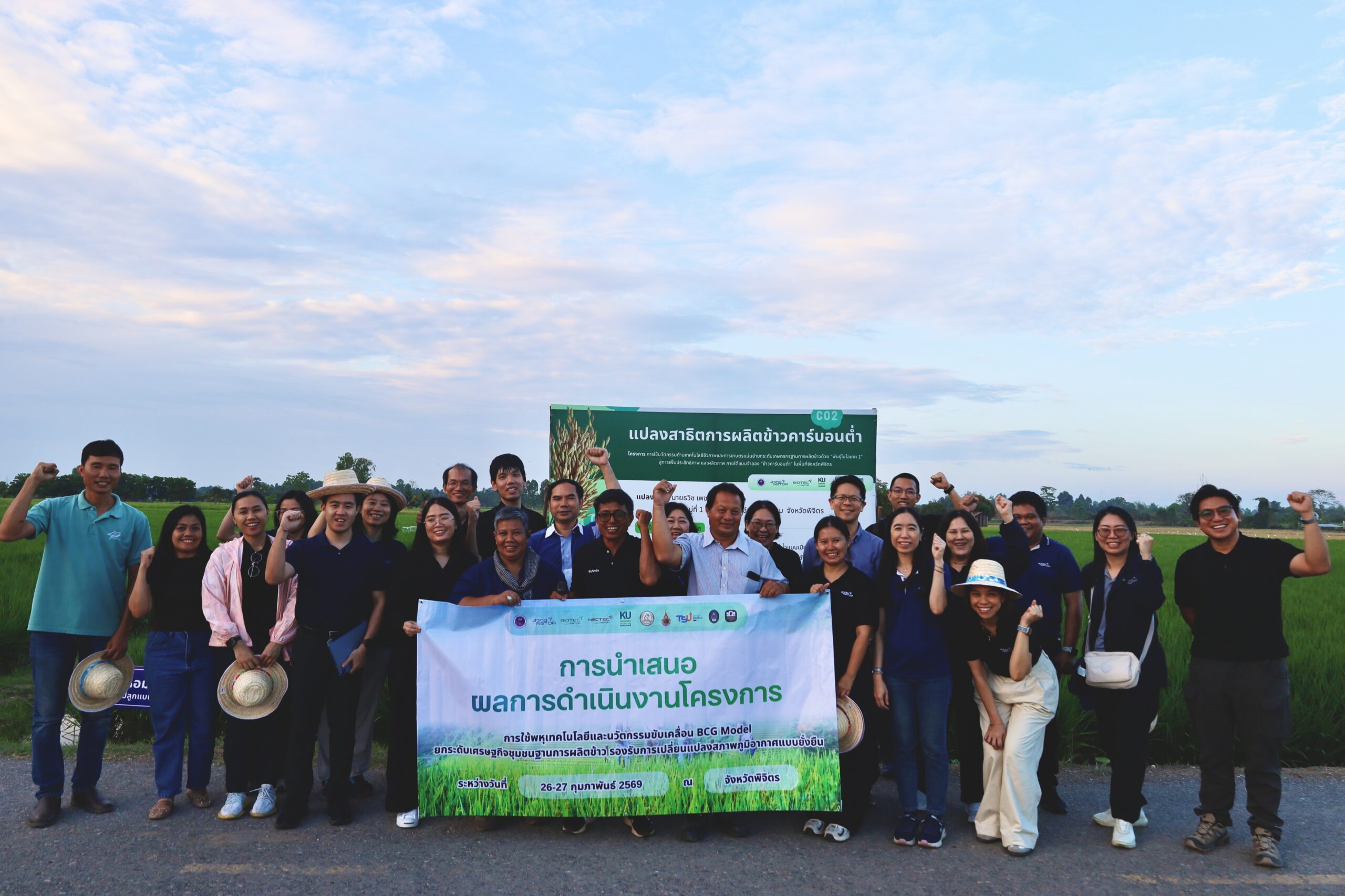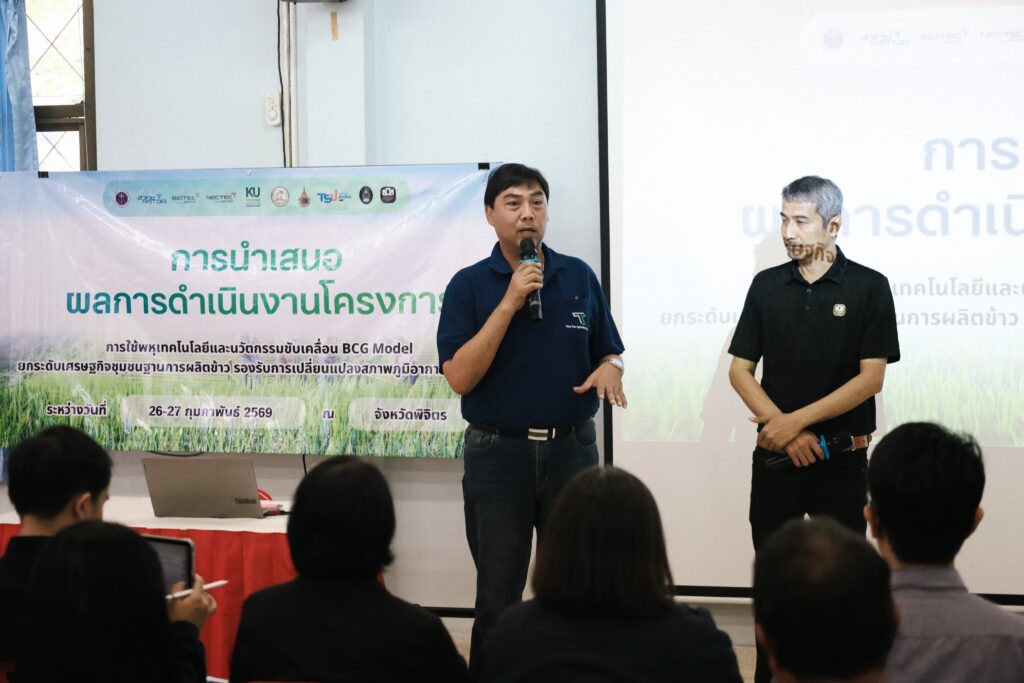 (26 กุมภาพันธ์ 2569) ณ จังหวัดพิจิตร – สำนักงานพัฒนาวิทยาศาสตร์และเทคโนโลยีแห่งชาติ (สวทช.) กระทรวงการอุดมศึกษา วิทยาศาสตร์ วิจัยและนวัตกรรม (อว.) นำโดย ดร.นวลวรรณ สงวนศักดิ์ ผู้ช่วยผู้อำนวยการ สวทช. และ ดร.สิทธิโชค ตั้งภัสสรเรือง รองผู้อำนวยการศูนย์พันธุวิศวกรรมและเทคโนโลยีชีวภาพแห่งชาติ (ไบโอเทค) พร้อมด้วยคณะนักวิจัย ร่วมกับ ธนาคารเพื่อการเกษตรและสหกรณ์การเกษตร (ธ.ก.ส.) จังหวัดพิจิตร และหน่วยงานภาคีเครือข่าย นำคณะจากสำนักงบประมาณ นำโดย นางสาวสัมพันธ์ บัวสังข์ นักวิเคราะห์งบประมาณชำนาญการพิเศษ ลงพื้นที่ติดตามผลการดำเนินงานโครงการ “การใช้พหุเทคโนโลยีและนวัตกรรมขับเคลื่อน BCG Model ยกระดับเศรษฐกิจชุมชนฐานการผลิตข้าวรองรับการเปลี่ยนแปลงสภาพภูมิอากาศแบบยั่งยืน” ระหว่างวันที่ 26 – 27 กุมภาพันธ์ 2569 เพื่อโชว์ศักยภาพการผลิตข้าวแนวใหม่ที่เน้นมูลค่าสูงและเป็นมิตรต่อสิ่งแวดล้อม