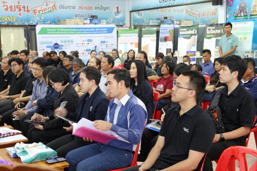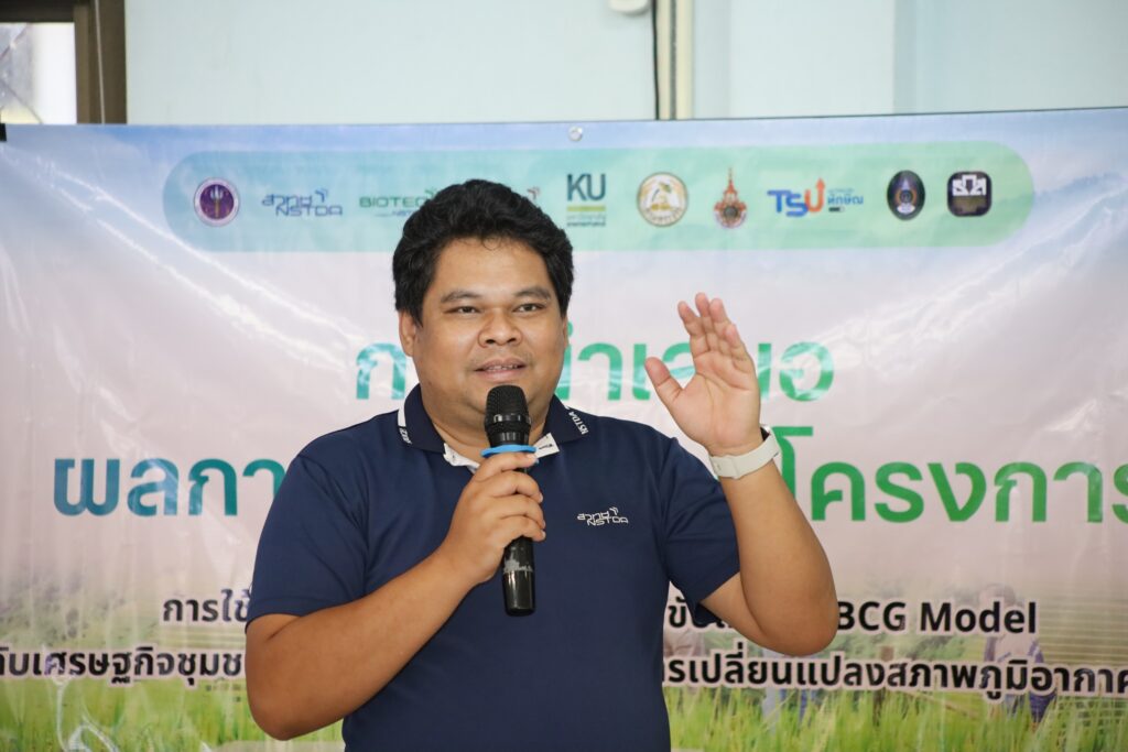 ดร.สิทธิโชค ตั้งภัสสรเรือง รองผู้อำนวยการไบโอเทค สวทช. กล่าวว่า โครงการนี้ได้รับงบประมาณสนับสนุนปี 2568 เพื่อแก้ปัญหาความเปราะบางในภาคการผลิตข้าว โดยมุ่งเน้นการเปลี่ยนผ่านสู่ระบบการผลิตที่มีประสิทธิภาพผ่านกลไกความร่วมมือแบบ 4P (Public-Private-People-Professional partnership) ซึ่งจากการดำเนินงานที่ผ่านมา โครงการสามารถบรรลุผลสัมฤทธิ์สูงกว่าเป้าหมาย โดยเฉพาะการถ่ายทอดเทคโนโลยีให้เกษตรกรได้ถึง 2,700 คน (คิดเป็น 180% ของเป้าหมาย) ครอบคลุมทั้งการสร้างชุมชนต้นแบบนวัตกรรมและการพัฒนาผลิตภัณฑ์มูลค่าเพิ่ม