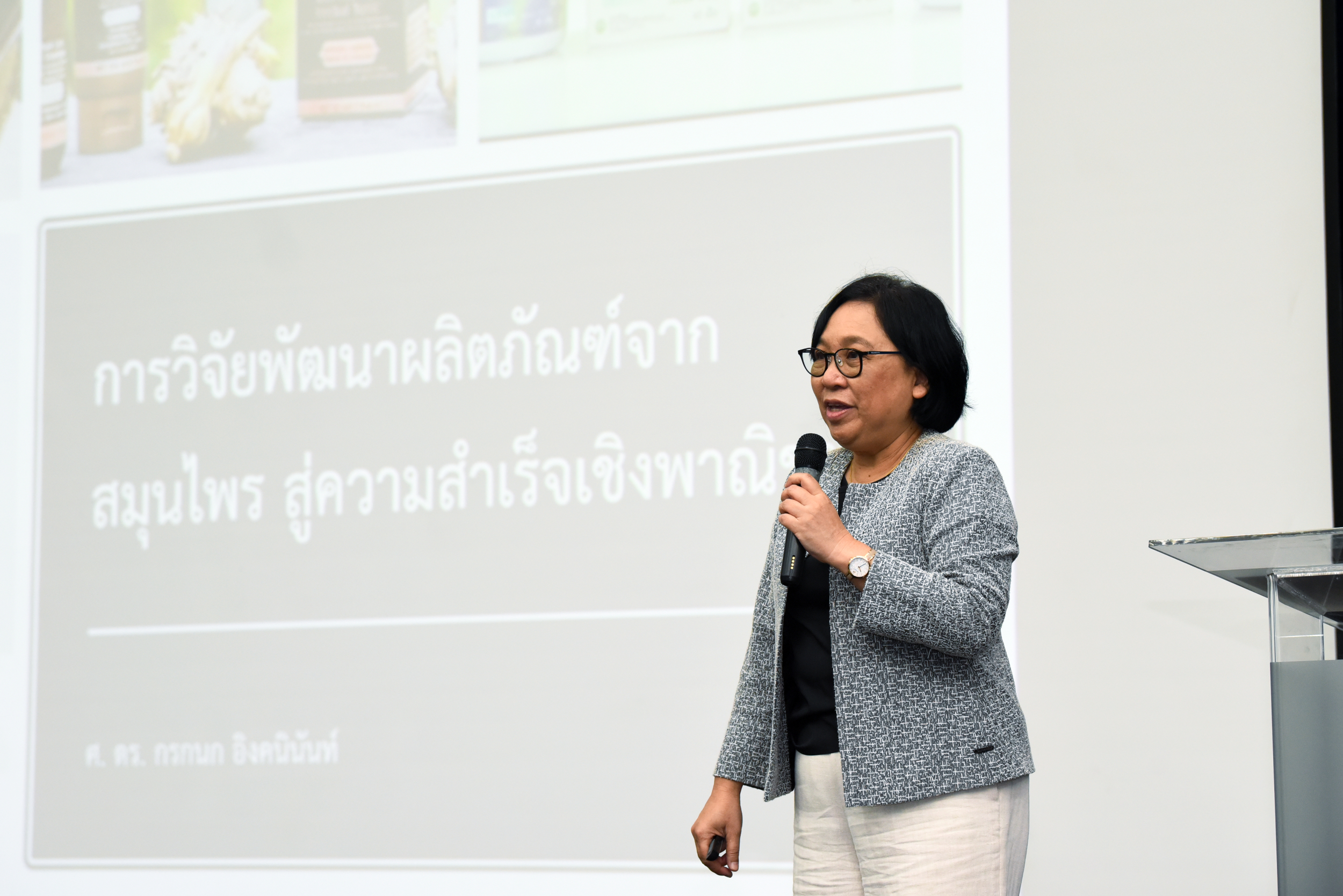 ในโอกาสนี้ ศาสตราจารย์ ดร. ภญ. กรกนก อิงคนินันท์ รองอธิการบดีฝ่ายพัฒนางานวิจัยและนวัตกรรม มหาวิทยาลัยนเรศวร ร่วมบรรยายเรื่องการพัฒนาสมุนไพรใหม่ สูตรสำเร็จสู่เชิงพาณิชย์ โดยมุ่งเน้นสร้างแรงบันดาลใจ และให้ความรู้กับผู้ประกอบการสมุนไพร ในการพัฒนาสมุนไพรใหม่สู่เชิงพาณิชย์ ผ่านการแลกเปลี่ยนประสบการณ์การทำงานวิจัย (ผู้ประกอบการเข้าใจกระบวนการ Research Commercialization)