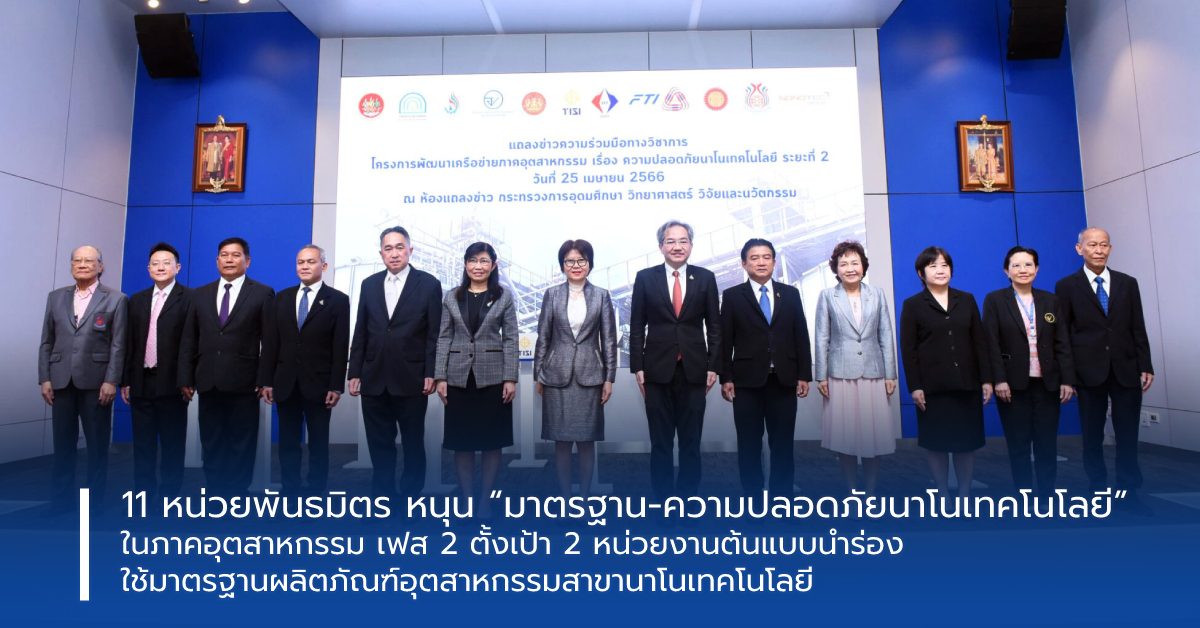 11 หน่วยพันธมิตร หนุน “มาตรฐาน-ความปลอดภัยนาโนเทคโนโลยี” ในภาคอุตสาหกรรม เฟส 2 ตั้งเป้า 2 หน่วยงานต้นแบบนำร่องใช้มาตรฐานผลิตภัณฑ์อุตสาหกรรมสาขานาโนเทคโนโลยี