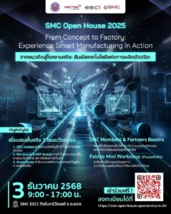 🏭ก้าวสู่อนาคตการผลิตอัจฉริยะ!ขอเชิญผู้ประกอบการ ผู้บริหารวิศวกร นักนวัตกรรม โรงงานอุตสาหกรรม และผู้สนใจด้านเทคโนโลยี เข้าร่วม SMC Open House 2025 งานเปิดบ้านครั้งใหญ่ของศูนย์นวัตกรรมการผลิตยั่งยืน (SMC) ที่จะพาคุณ From Concept to Factory: Experience Smart Manufacturing in Action จากแนวคิดสู่โรงงานจริง: สัมผัสเทคโนโลยีแห่งการผลิตอัจฉริยะ 📅 วันพุธที่ 3 ธันวาคม 2568🕘 เวลา 09.00 – 17.00 น.📍 SMC, EECi วังจันทร์วัลเลย์ จังหวัดระยอง ✨ ไฮไลต์ที่คุณจะได้พบ• เปิดบ้านเยี่ยมชม Testbed สาธิตระบบอัตโนมัติ IoT และโซลูชันอัจฉริยะมากมาย• เดินเยี่ยมชมบูธจากทีมวิจัยและพันธมิตรเทคโนโลยี พร้อมพูดคุย แลกเปลี่ยนแนวคิด และค้นหาเทคโนโลยีที่เหมาะกับโรงงานของคุณ• พบผู้เชี่ยวชาญด้านการผลิตดิจิทัล