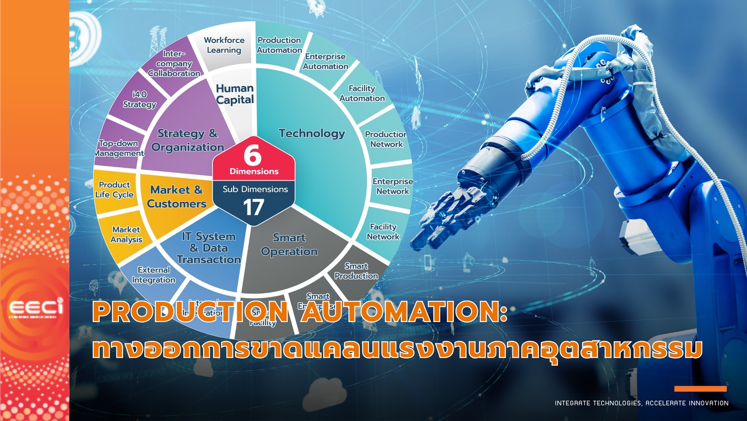 มิติที่ 1 เทคโนโลยี (Technology) (6 มิติย่อย): การทำความเข้าใจเกี่ยวกับระบบอัตโนมัติ (Automation), การเชื่อมต่อเครือข่าย (Connectivity), และการนำเทคโนโลยีดิจิทัลมาใช้ในกระบวนการผลิตและระบบบริหาร