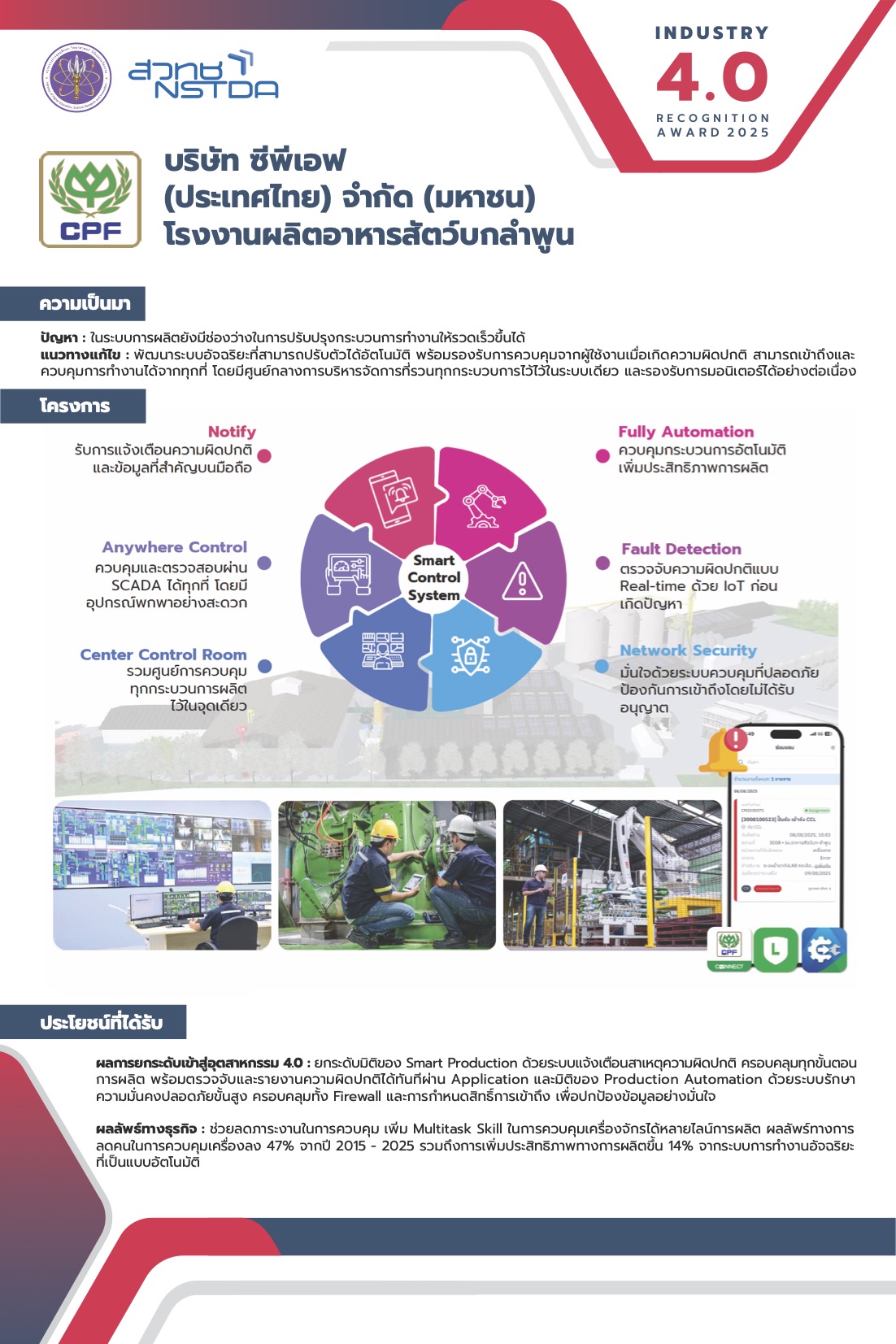 ผลการยกระดับเข้าสู่อุตสาหกรรม 4.0 : ยกระดับมิติของ Smart Production ด้วยระบบแจ้งเตือนสาเหตุความผิดปกติ ครอบคลุมทุกขั้นตอนการผลิต พร้อมตรวจจับและรายงานความผิดปกติได้ทันทีผ่าน Application และมิติของ Production Automation ด้วยระบบรักษาความมั่นคงปลอดภัยขั้นสูง ครอบคลุมทั้ง Firewall และการกำหนดสิทธิ์การเข้าถึง เพื่อปกป้องข้อมูลอย่างมั่นใจ